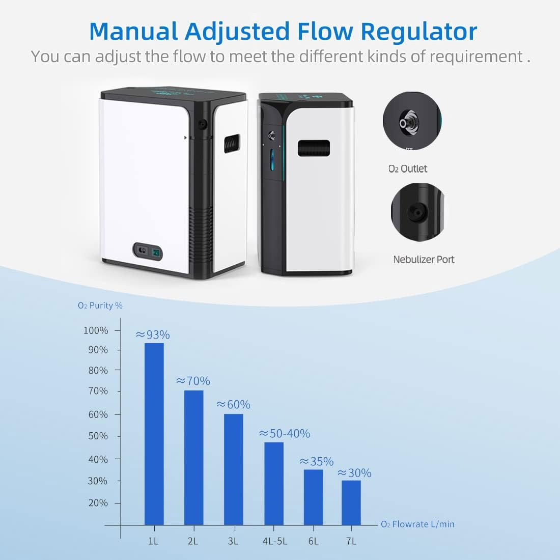Wyjście tlenu na poziomie 30-90% czystości zapewnia zdrowe i świeże powietrze w Twoim domu. Dzięki regulacji przepływu od 1 do 7 l/min dostosujesz urządzenie do swoich potrzeb i zawsze będziesz oddychać czystym tlenem.