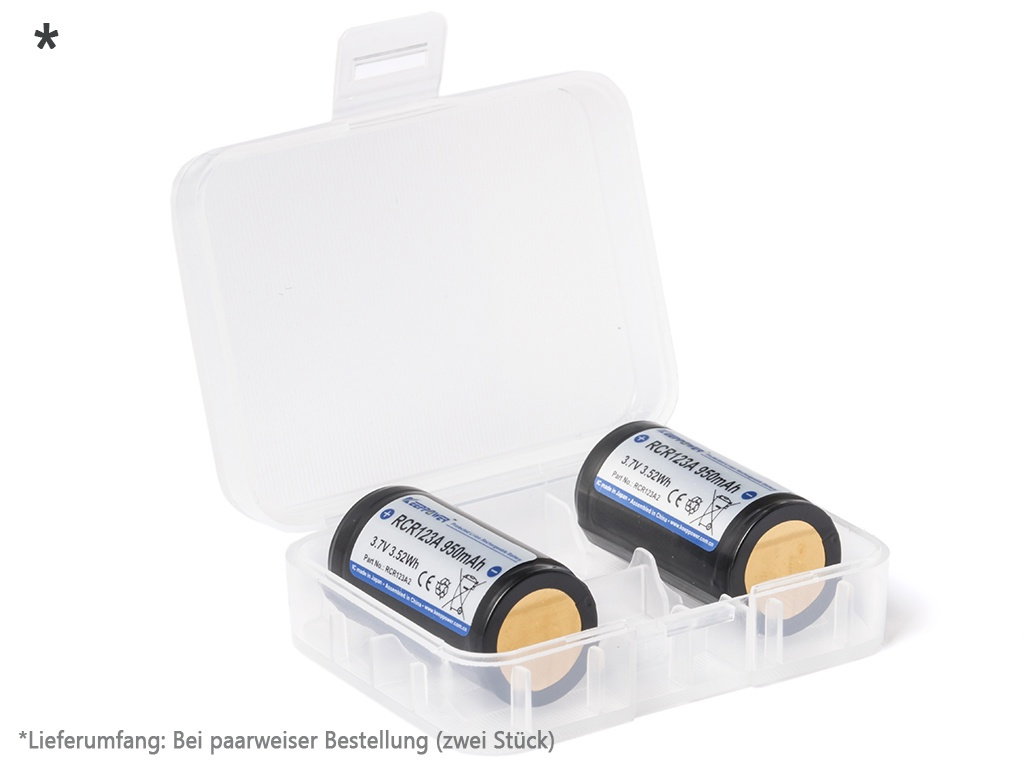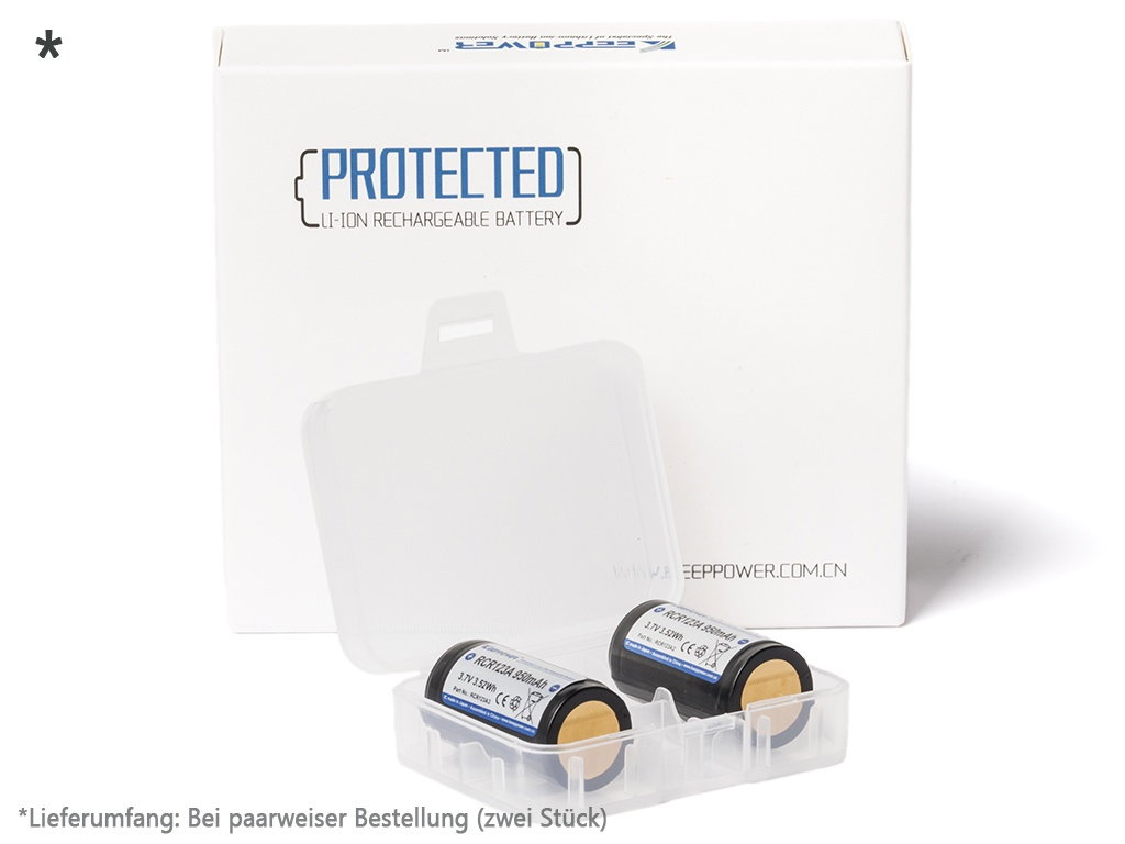 1x akumulator Keeppower RCR123A. Przy zamówieniu w parach (dwie sztuki) ogniwa dostarczane są w pudełku ochronnym.