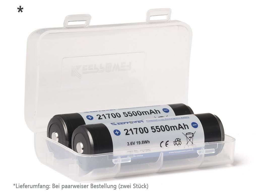 1 sztuka Keeppower 21700 - 5500mAh, 3,6V - 3,7V Li-Ion z zabezpieczeniem PCB Akumulatory zamawiane w parach (dwie sztuki) są dostarczane z pudełkiem do przechowywania.