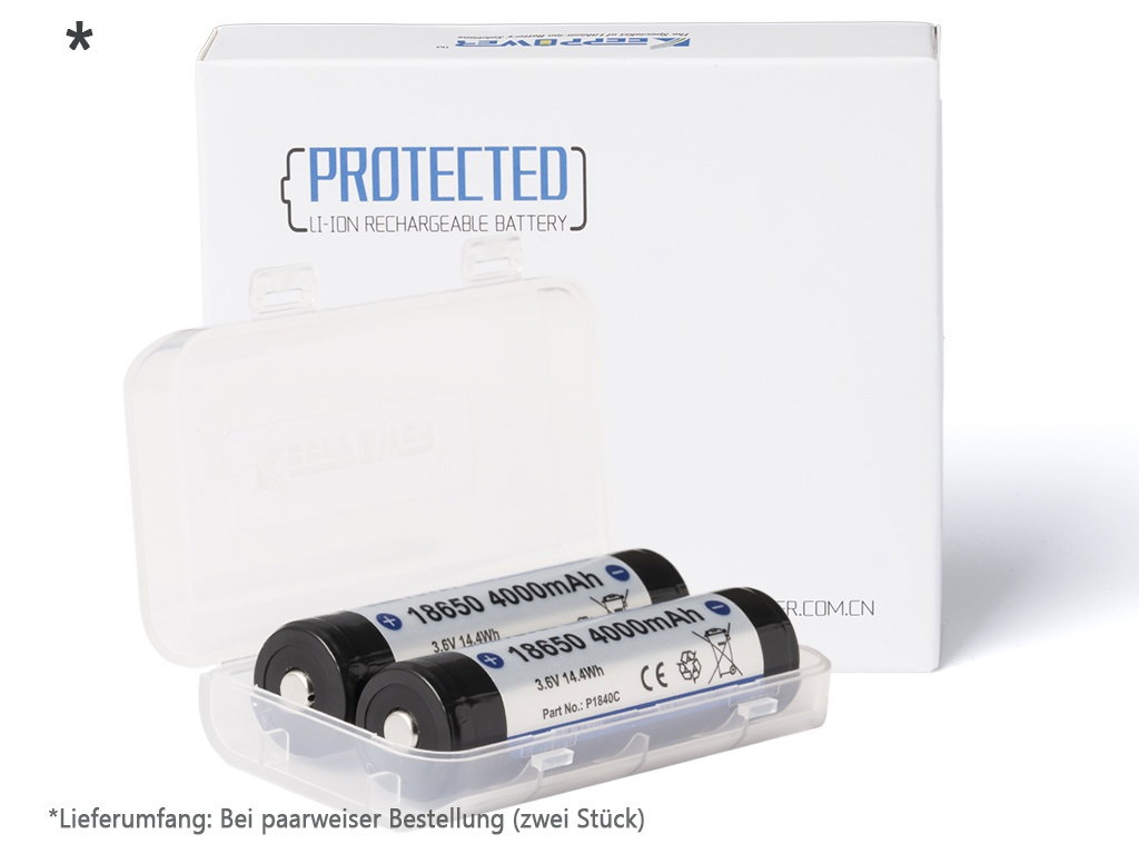 Zakres dostawy: 1 szt. Keeppower 18650 - P1840C 4000mAh Przy zamówieniu dwóch akumulatorów pudełko zabezpieczające akumulatory jest dostarczane bezpłatnie.