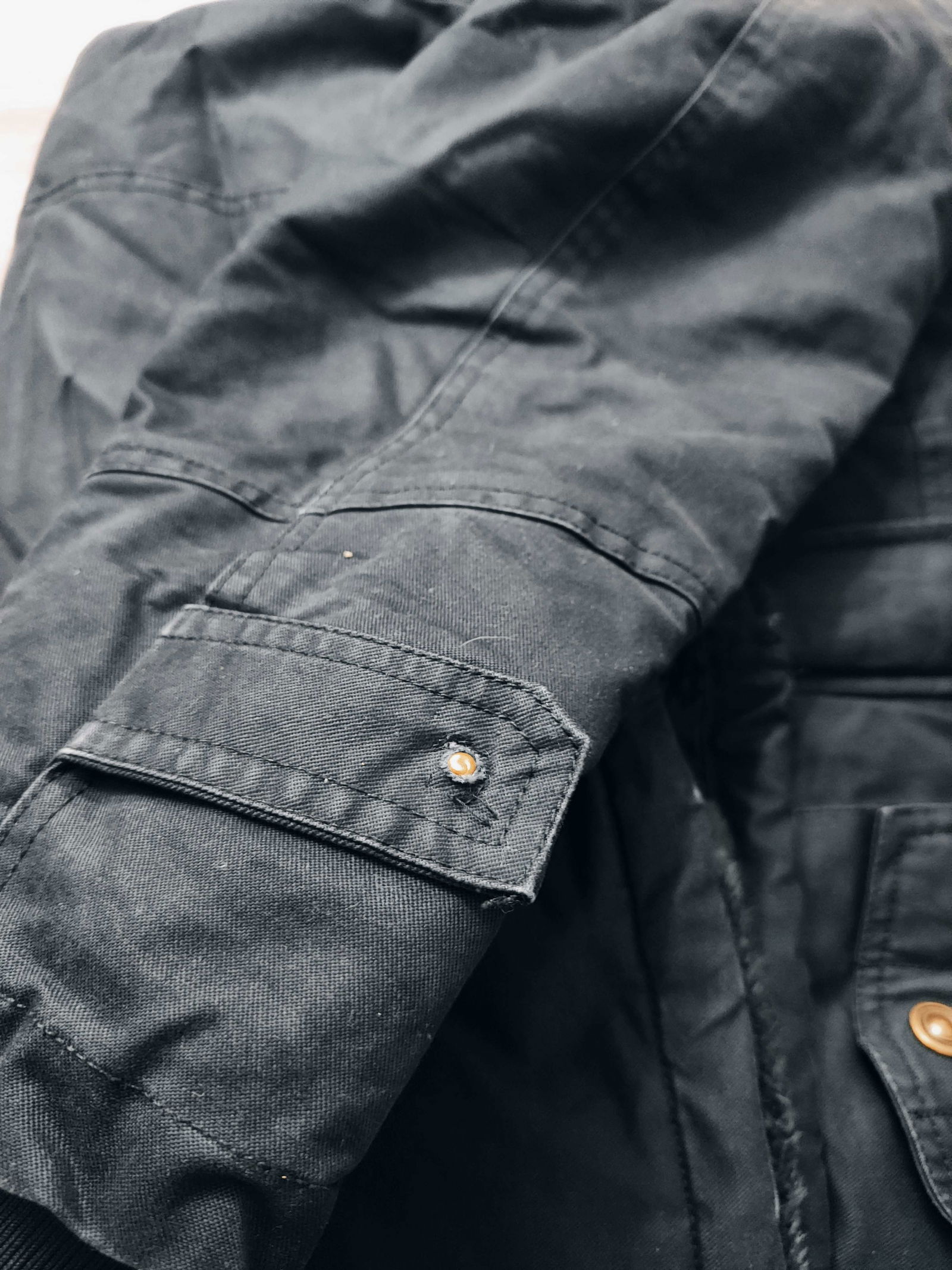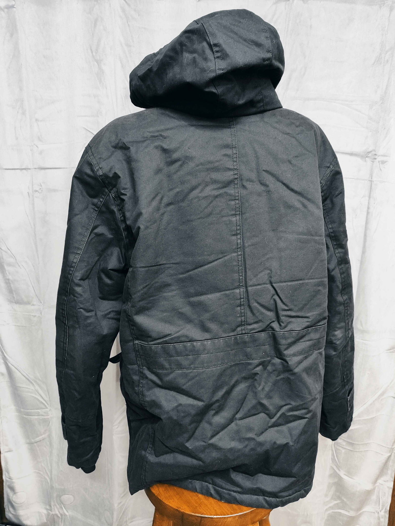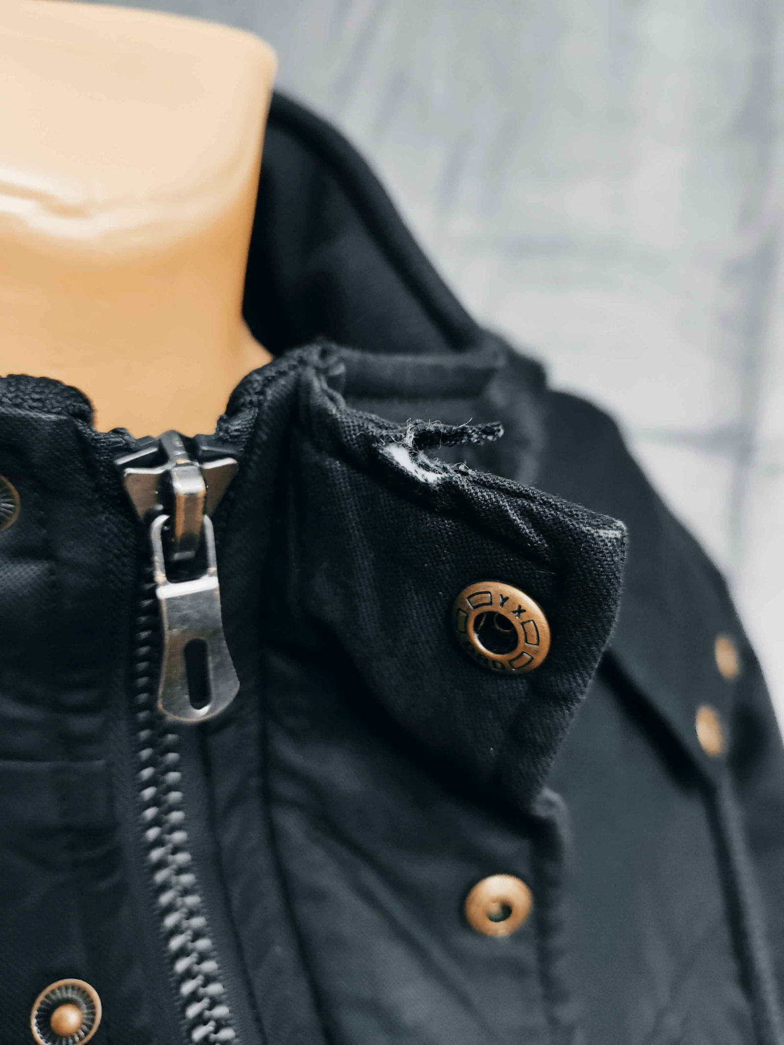 Kurtka jest w stanie bardzo dobrym - posiada wadę w postaci brakującego jednego guzika na rękawie.