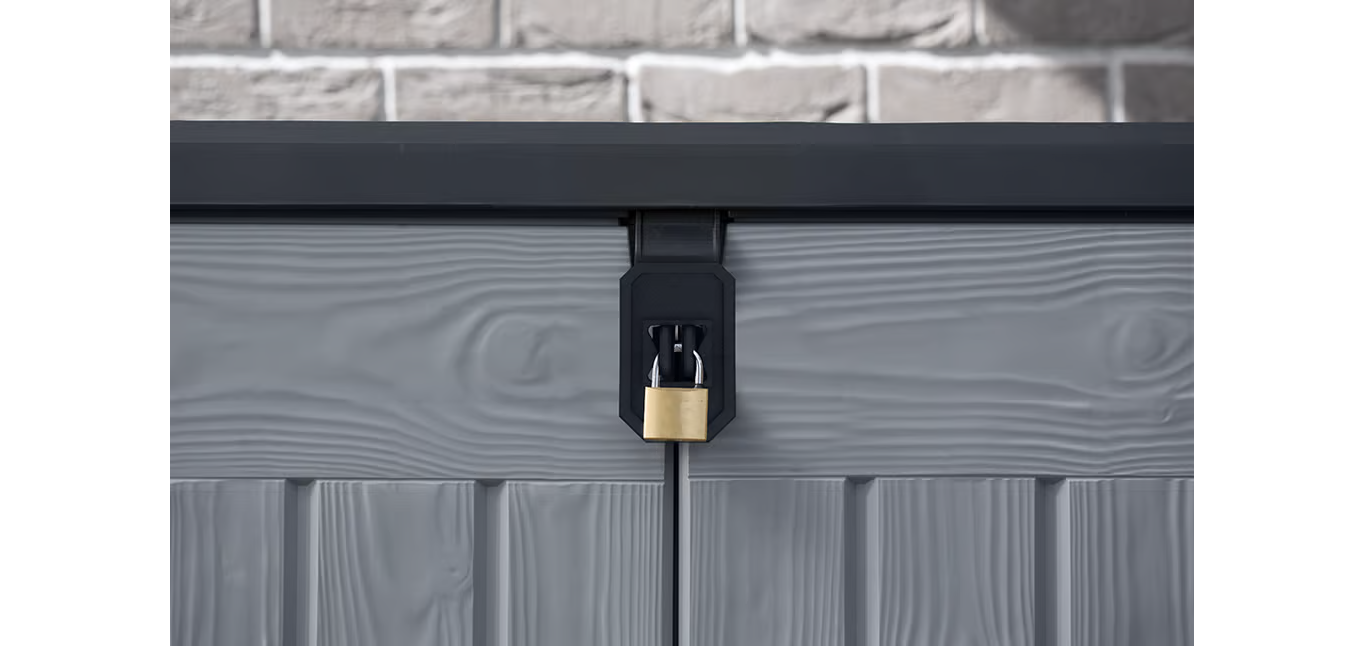 Drzwi są zamykane na klucz, a sprężyny hydrauliczne na pokrywie zapewniają łatwe otwieranie, nawet 1 ręką.Store-It-Out Pro utrzymuje zawartość w suchości i wentylacji podczas deszczu i słońca.