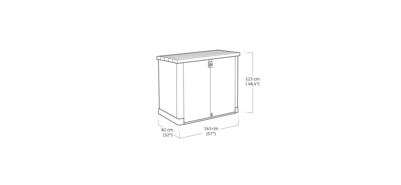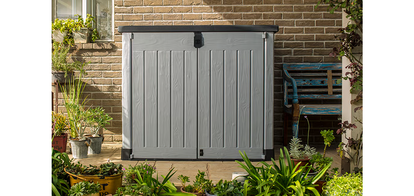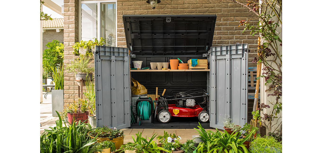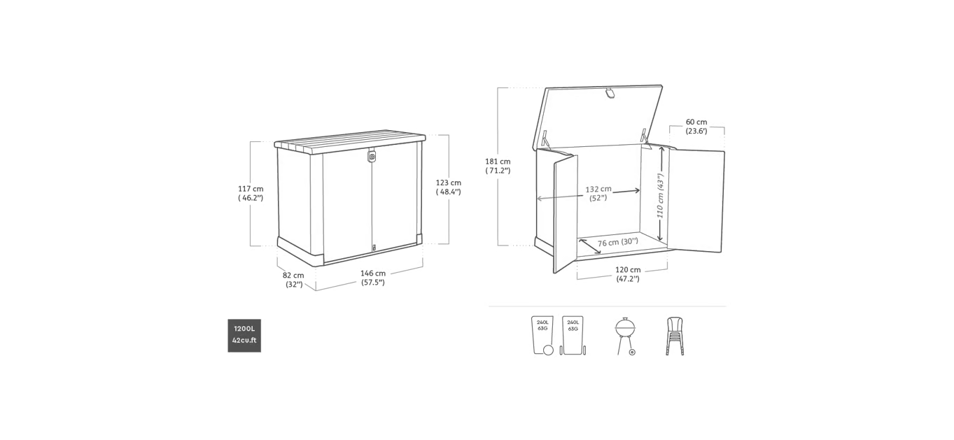 Idealny do mebli ogrodowych, grilli lub innych przedmiotów o pojemności 1200 l i skośnym progu, który ułatwia wsuwanie i wyjmowanie cięższych mebli.