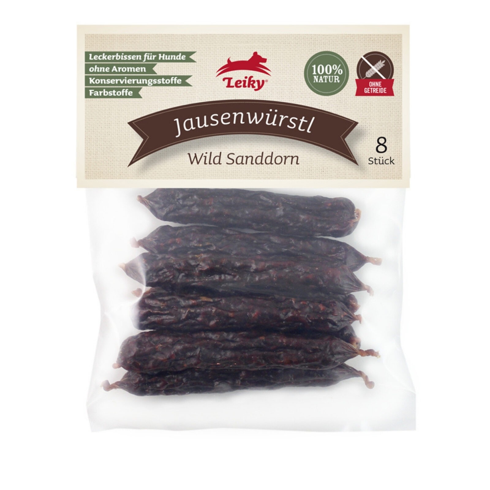 Leiky kiełbaski z dziczyzną i rokitnikiem 8 sztuk, 99% mięsa. Zdrowe kabanosy dla psa. Tylko dwa składniki, bez zbóż i bez konserwantów. Jeśli szukasz naturalnej przekąski i cenisz dobre przejrzyste składy, kiełbaski Leiky to Twój naturalny wybór.