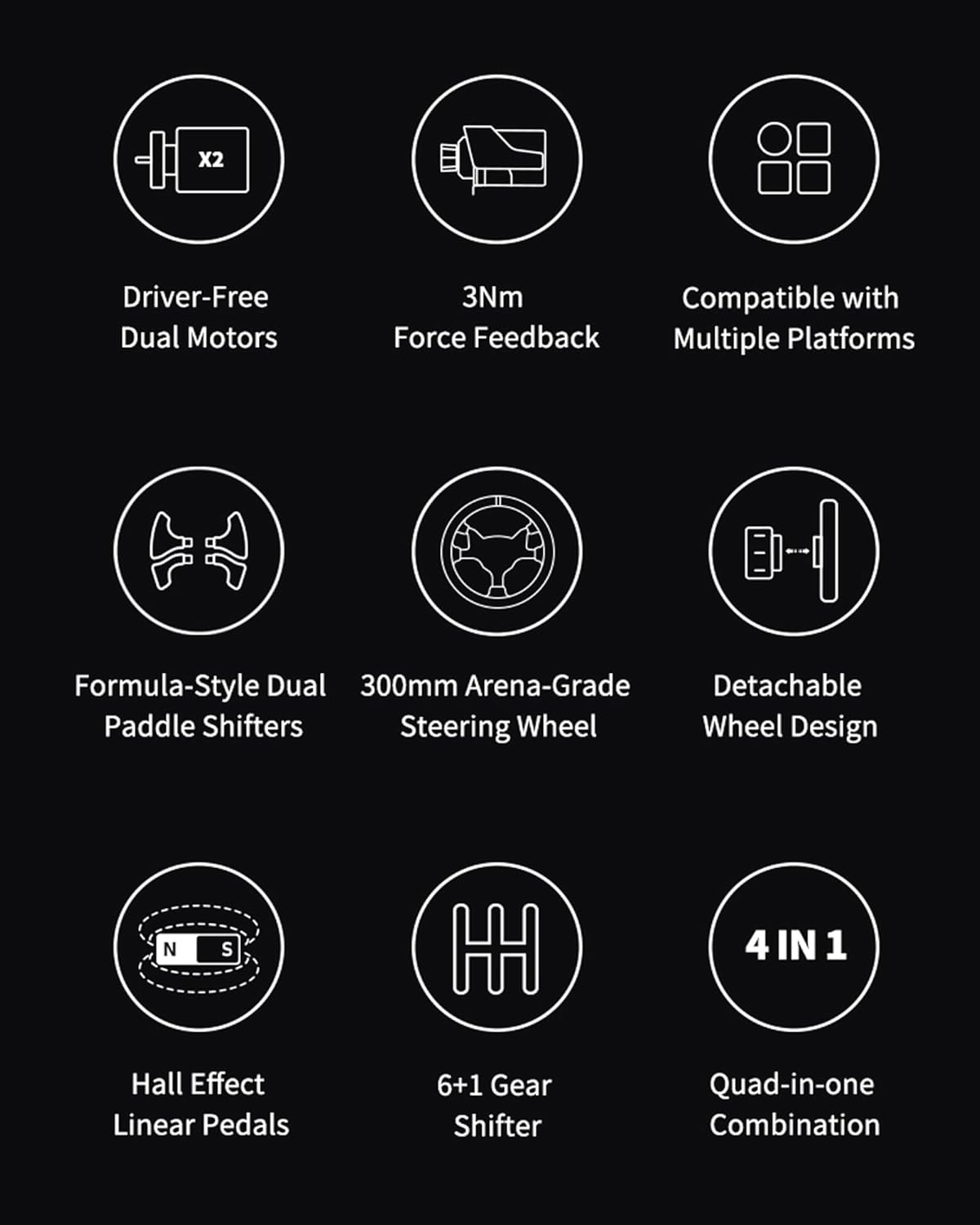 - Wymiary: 300 × 300 × 107 mm (kierownica); 230 × 223 × 140 mm (podstawa); 362 × 339 × 220 mm (panel z 3 pedałami), 192 × 105 × 201 mm (dźwignia zmiany biegów)