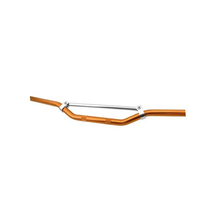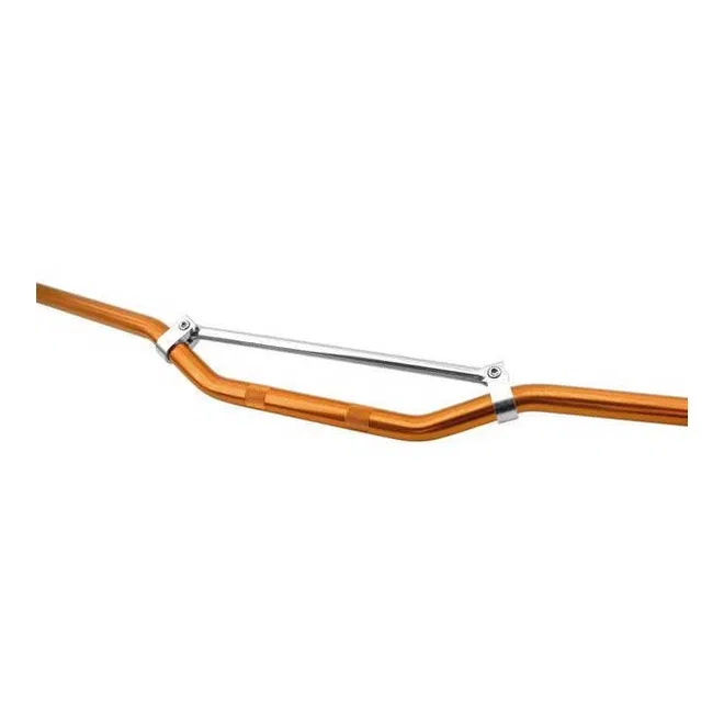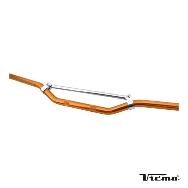 Kierownica motocyklowa marki VICMA o standardowej średnicy 22,2 mm (7/8 cala), wykonana z wytrzymałego materiału. Posiada pomarańczowe wykończenie oraz poprzeczkę wzmacniającą, co zwiększa jej sztywność i odporność na odkształcenia. Jest to element przeznaczony do szerokiej gamy motocykli, gdzie wymagana jest kierownica o podanej średnicy.
