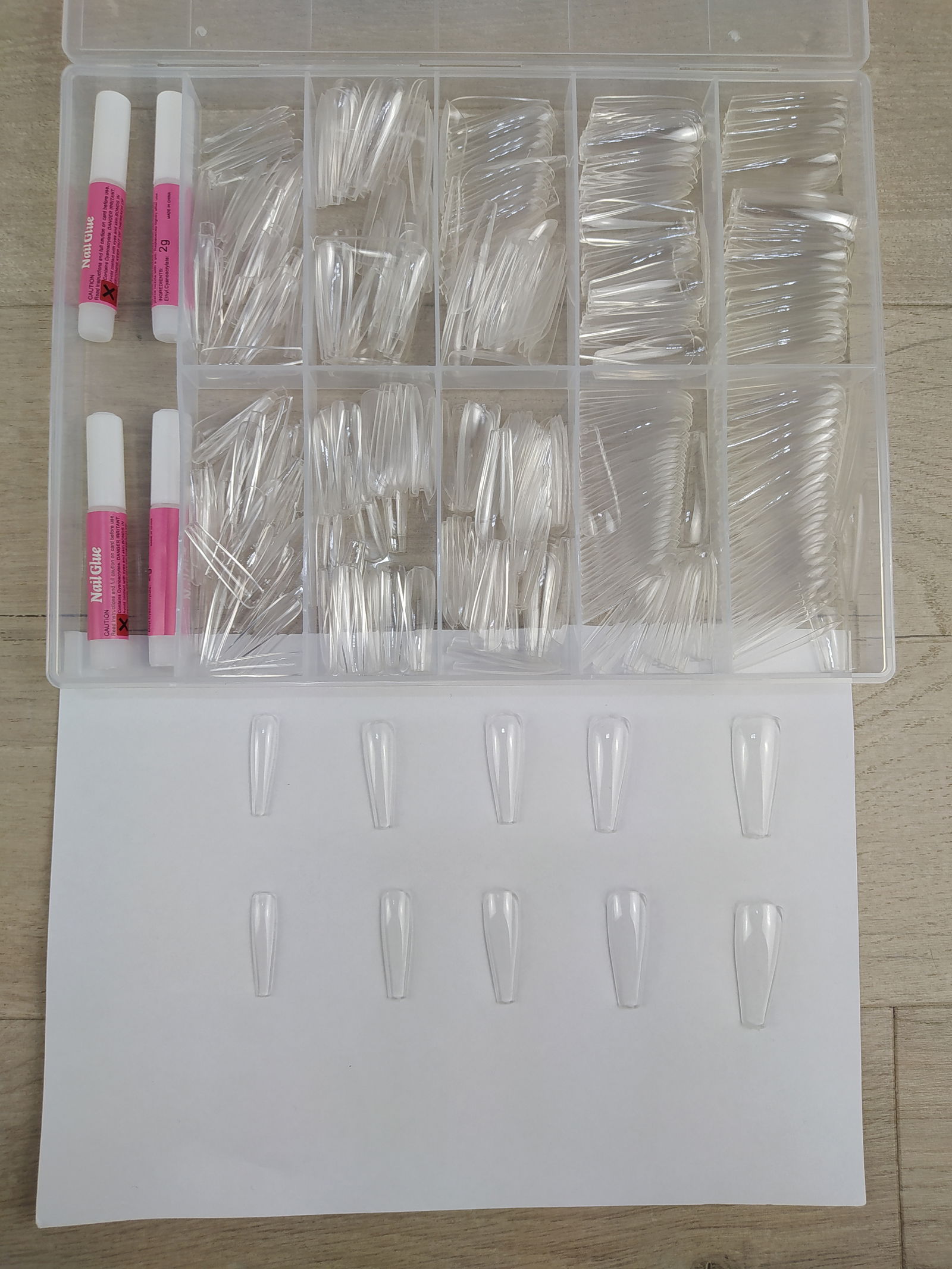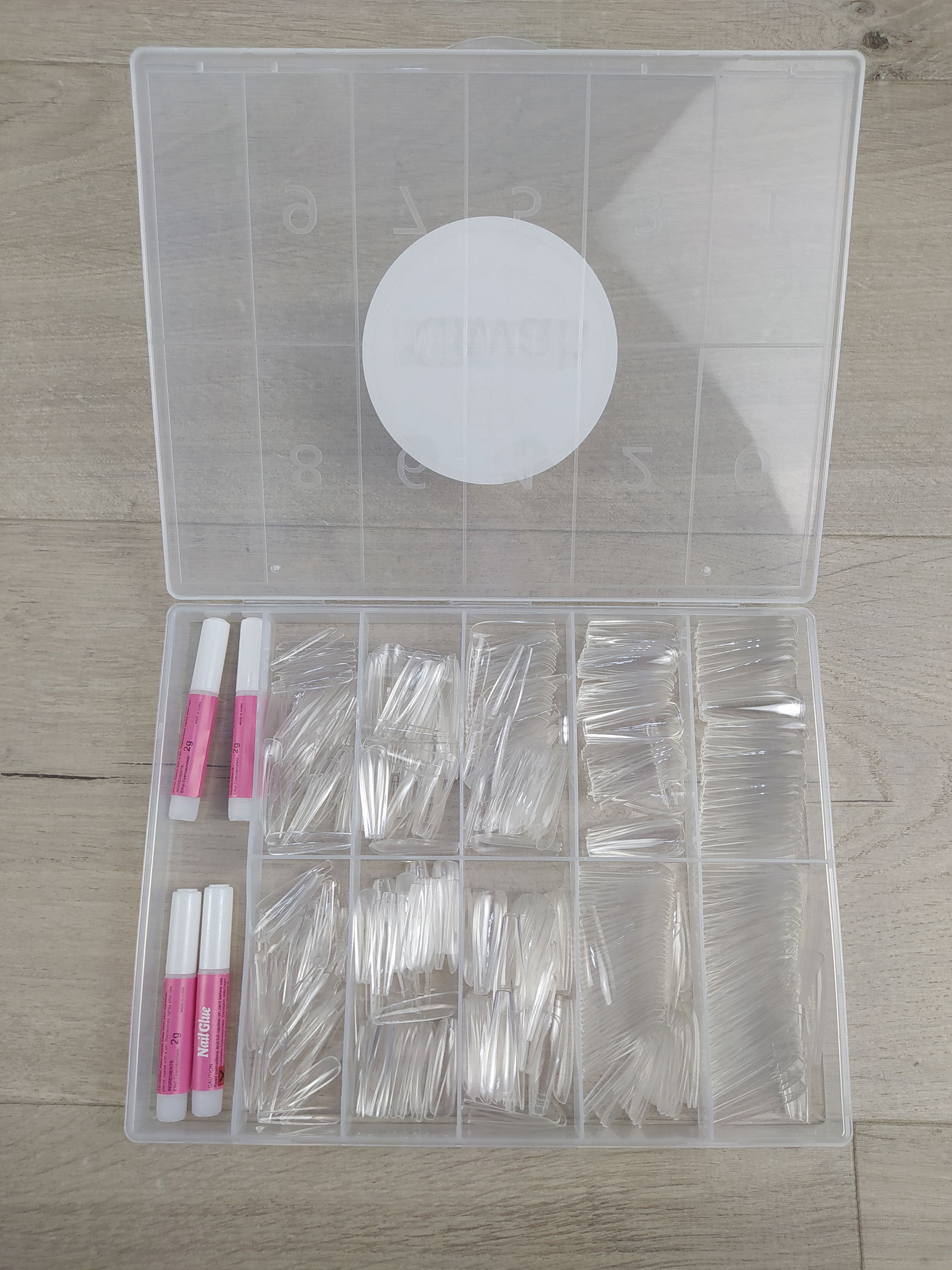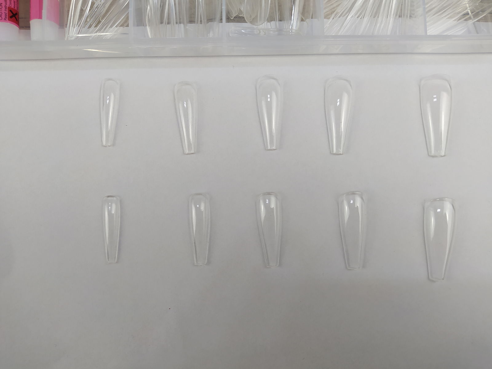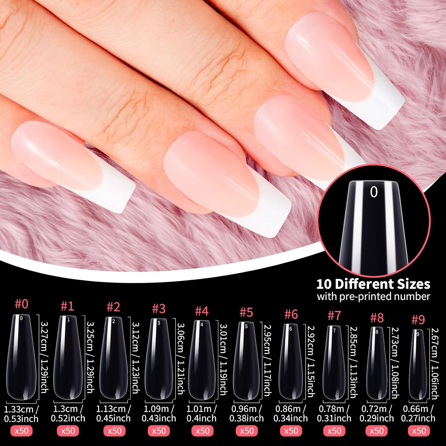 - 10 różnych rozmiarów - Ten zestaw sztucznych paznokci baletnicy, składający się z 500 elementów, jest dostępny w 10 różnych rozmiarach, po 50 paznokci każdego rozmiaru, ponumerowanych indywidualnie od 0 do 9. Dzięki temu możesz wygodnie wybrać najbardziej odpowiedni rozmiar do swojego palca.