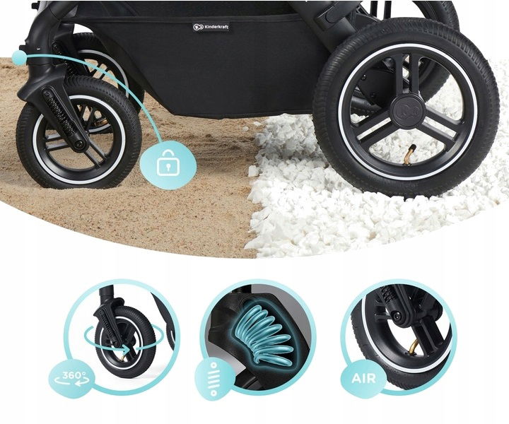 - Koła wykonano z odpornej na ścieranie gumy. Ułatwiają prowadzenie i manewrowanie wózkiem. Przednie koła obracają się o 360 stopni i mają możliwość blokady do jazdy na wprost. Doskonale sprawdzą się w miejskich uliczkach i na dłuższym spacerze po nierównej powierzchni.