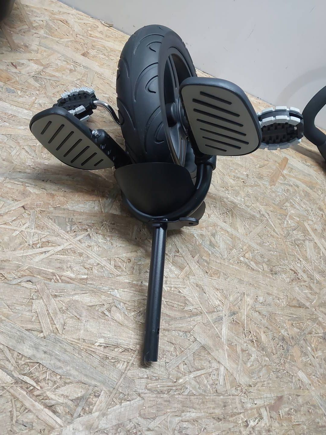 Przy przednim kole znajdują się składane podnóżki, na których maluch może oprzeć nogi. Sprawdzą się też w przypadku młodszych dzieci, które jeszcze nie dosięgają do pedałów.