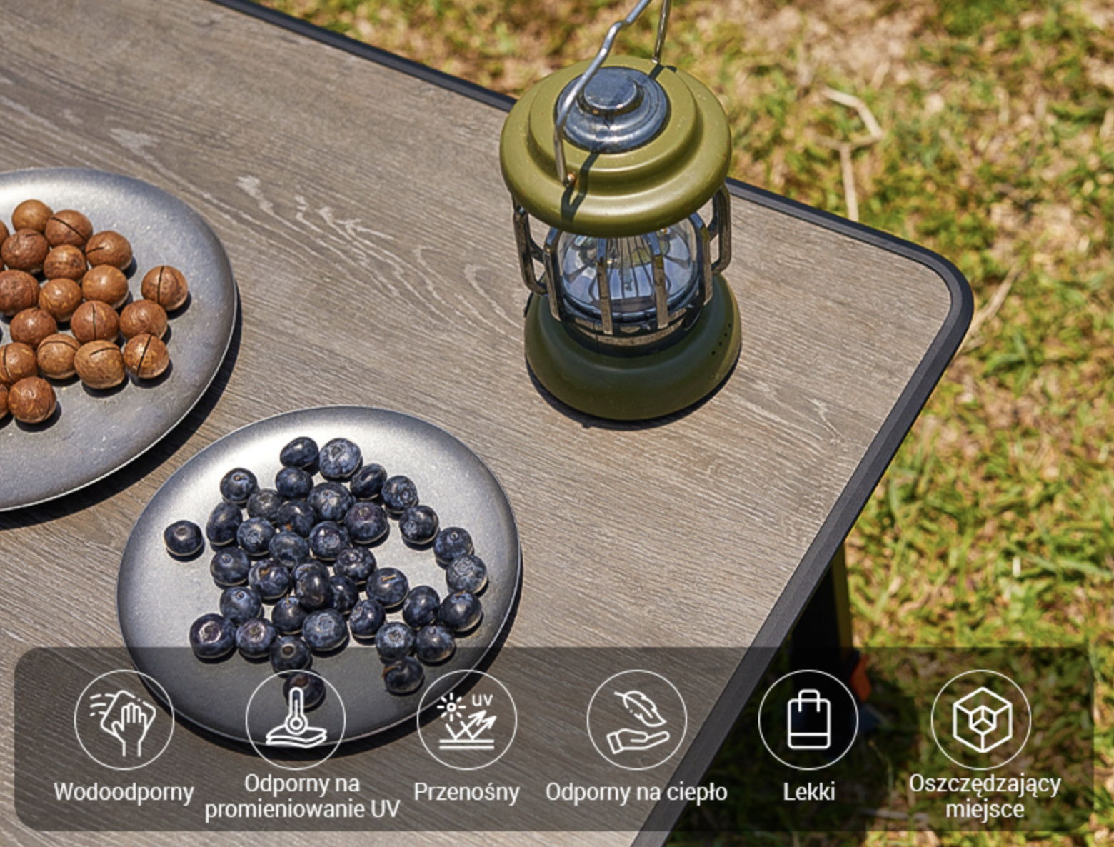 Blat stołu został wykonany z trwałego materiału kompozytowego o strukturze drewna, z dodatkowymi wzmocnieniami ze stopu aluminium na krawędziach. Dzięki temu jest lekki, odporny na promieniowanie UV i wysokie temperatury, wodoodporny oraz bardzo łatwy do utrzymania w czystości.