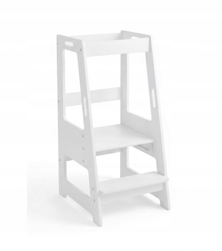 3-stopniowa regulacja wysokości: Dzięki łatwemu dopasowaniu podnóżka, wieża dosłownie rośnie razem z Twoim dzieckiem. Idealnie dopasujesz ją do wysokości blatów kuchennych i stołów.