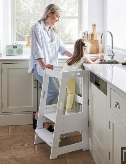 Twoje dziecko marzy o tym, by pomagać Ci w kuchni? Podest kuchenny BeZou to bezpieczny „łącznik” między światem malucha a dorosłych. Dzięki niej Twoja pociecha osiągnie wzrost pozwalający na swobodną naukę i zabawę przy blacie kuchennym czy stole.