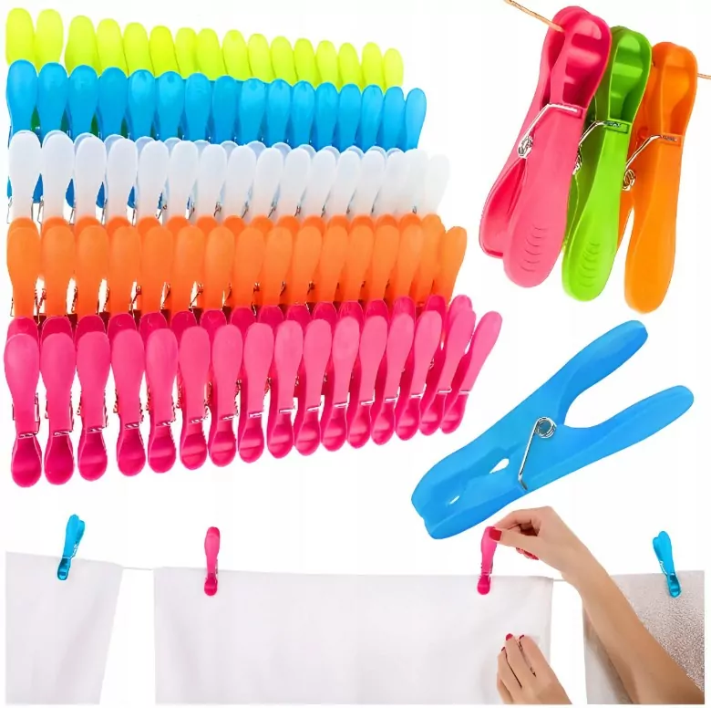 Mocne i trwałe spinacze wykonane z tworzywa sztucznego z metalową sprężynką. Odporne na warunki atmosferyczne, sprawdzą się zarówno w domu, jak i na zewnątrz. Idealne do wieszania różnych tkanin – od koców po delikatną bieliznę. Ergonomiczny kształt i mocny zacisk zapobiegają zsuwaniu się ubrań z linki.