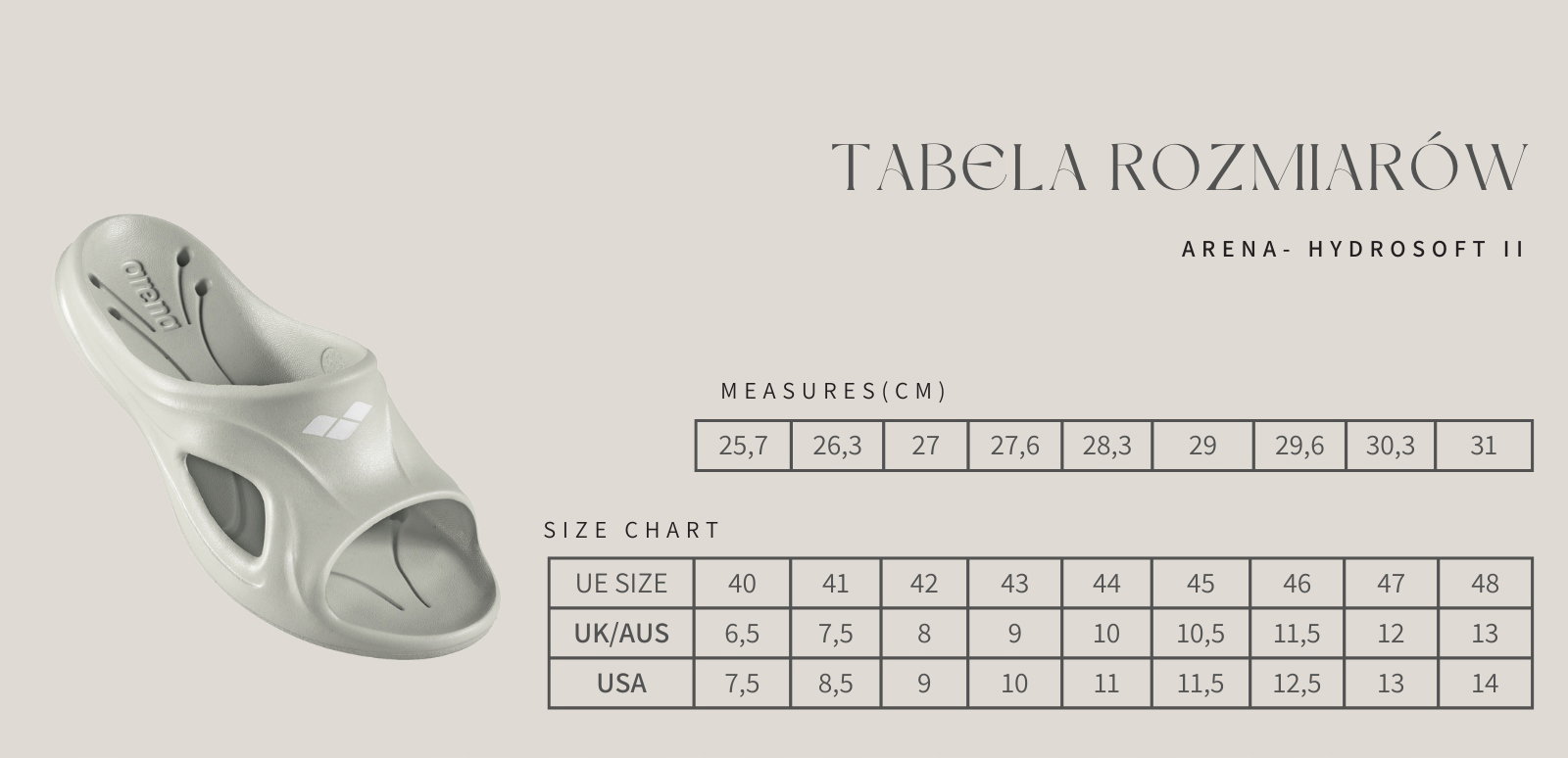Klapki Arena Hydrosoft II- nowa generacja kultowych klapek od areny! Klapki Hydrosoft II zostały wyposażone w system odprowadzania wilgoci- specjalne kanaliki dbają o prawidłowy przepływ powietrza. Miękka pianka amortyzująca sprawia, że są lżejsze i ułatwiają utrzymanie równowagi.