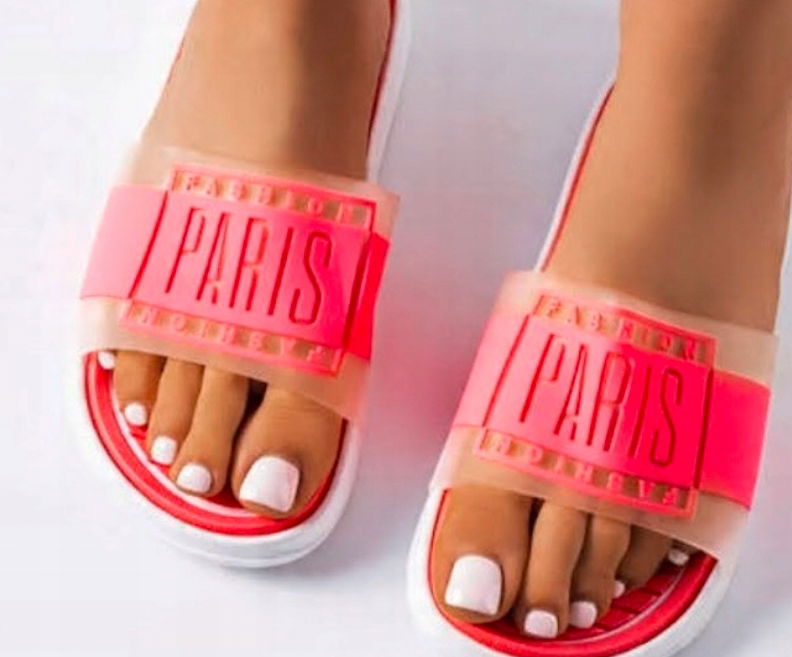 Paseczek z napisem „Fashion Paris” został wykonany z gumowego tworzywa, natomiast wkładka wraz z platformą z piankowego tworzywa.