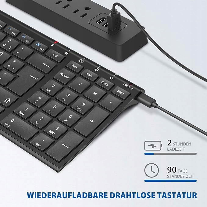 Wygodne ładowanie: Klawiatura iClever z możliwością ponownego ładowania jest wyposażona w wbudowany akumulator 280 mAh o dużej pojemności, dzięki czemu nie trzeba często wymieniać baterii. Jedno ładowanie przez 2 godziny może wytrzymać do 180 dni (w oparciu o 2 godziny użytkowania dziennie).