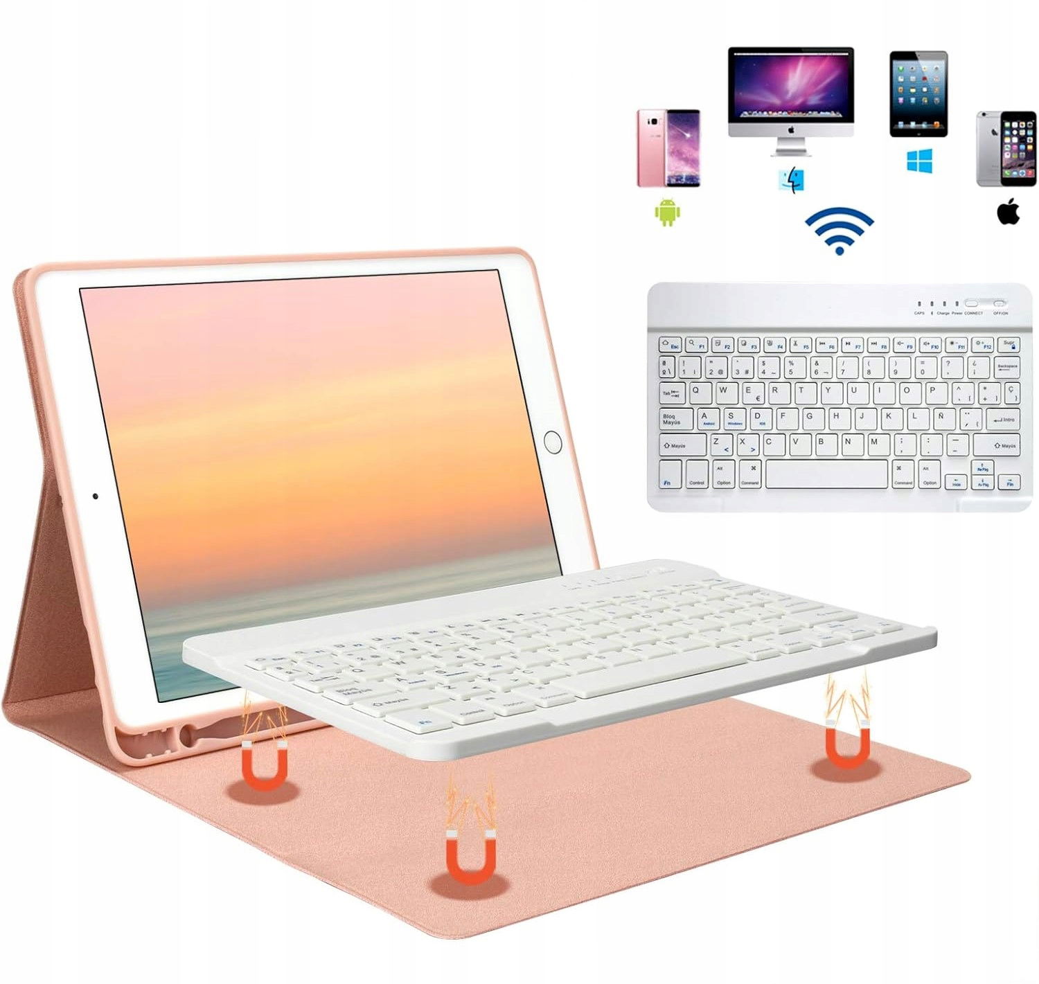 - Bezprzewodowa klawiatura Bluetooth: Klawiatura jest wyposażona w technologię Bluetooth, co zapewnia szybkie i stabilne połączenie z iPadem bez konieczności używania kabli. Klawiatura została zaprojektowana w układzie hiszpańskim, z literą "Ñ", co czyni ją idealnym wyborem dla hiszpańskojęzycznych użytkowników.