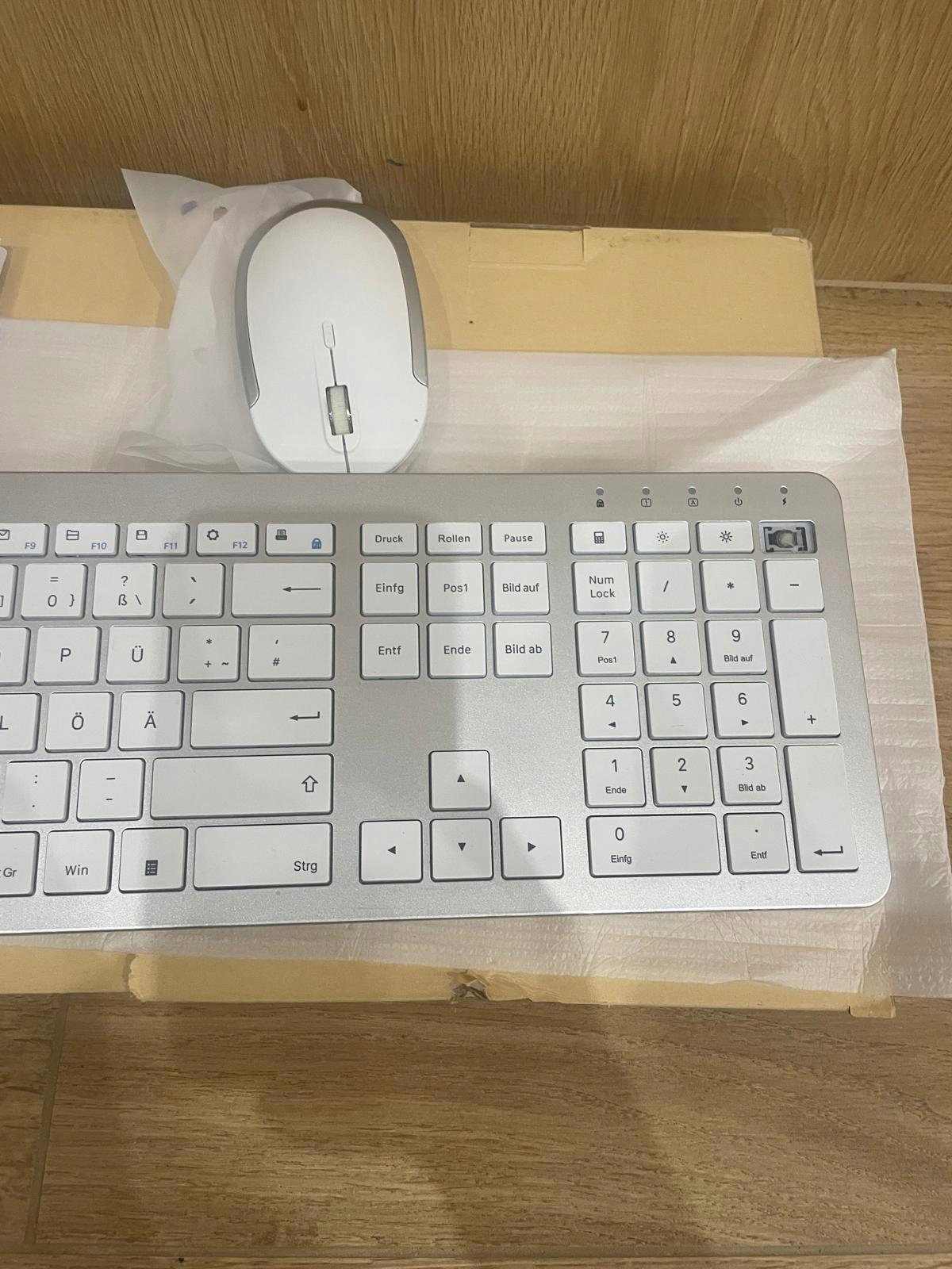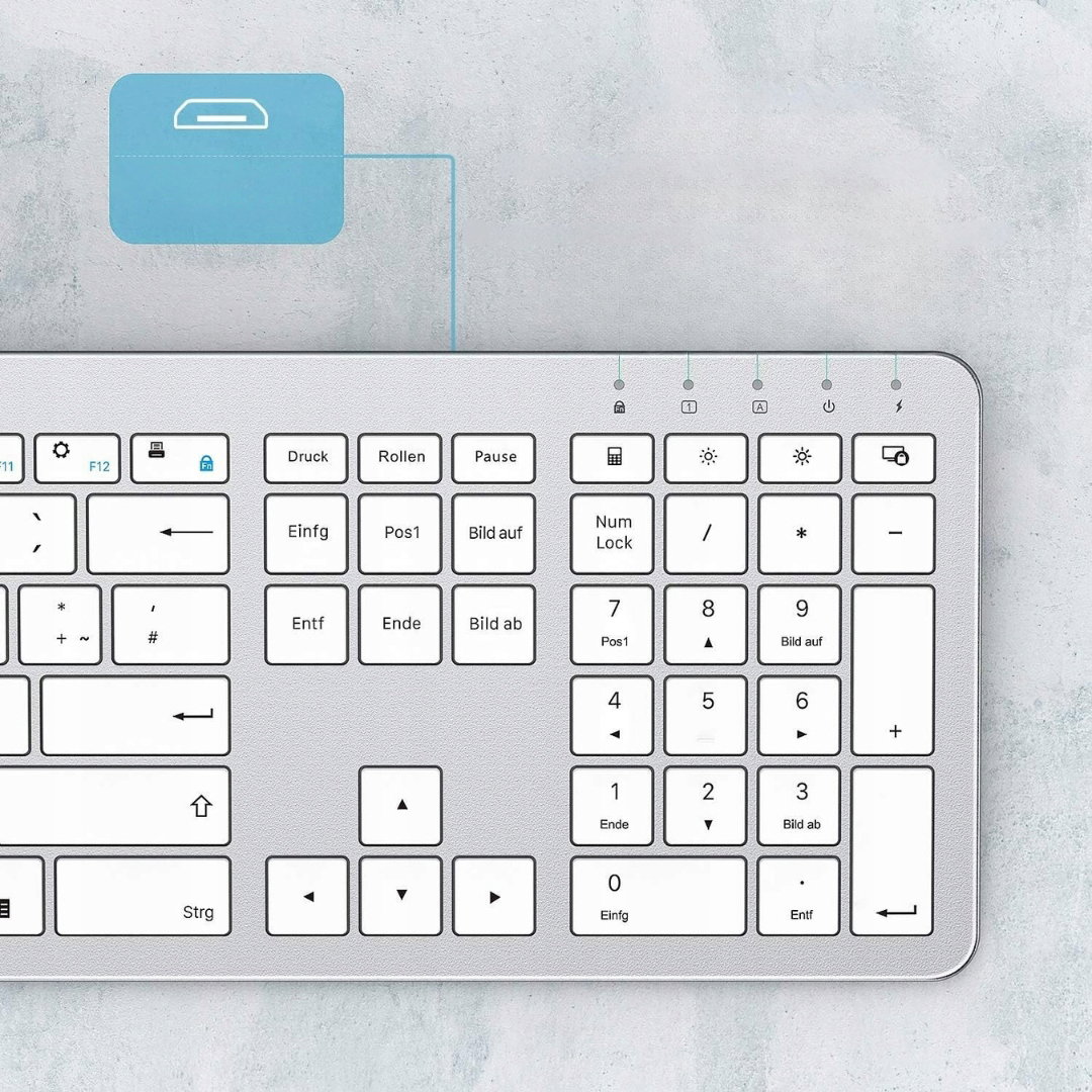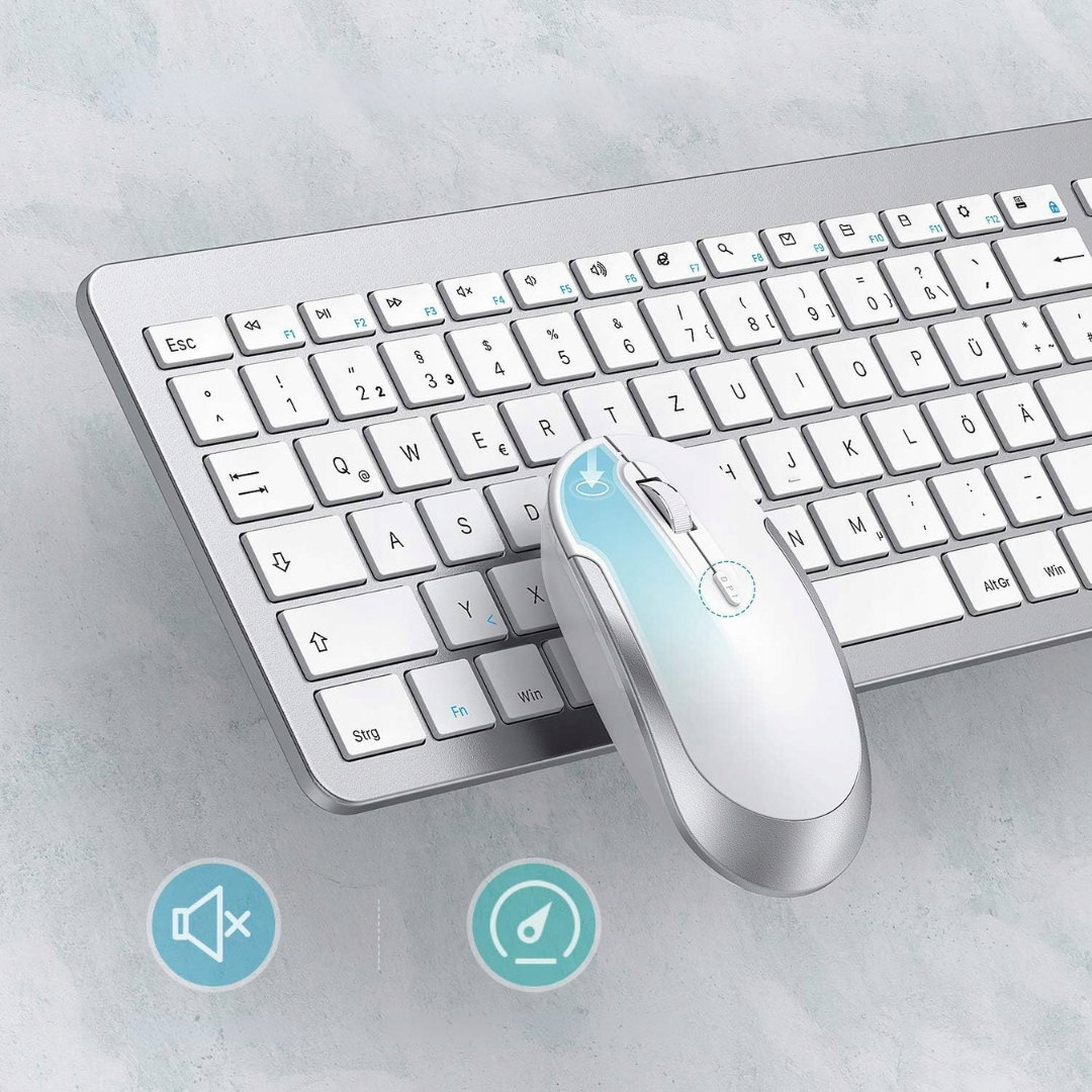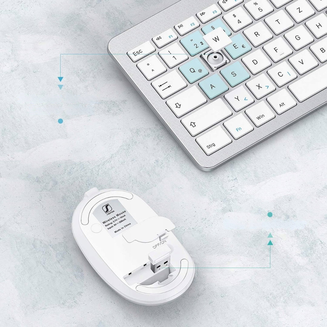 Seenda bezprzewodowy zestaw myszy i klawiatury z akumulatorem (kompaktowy rozmiar), ultracienki, cichy, biało-srebrny.