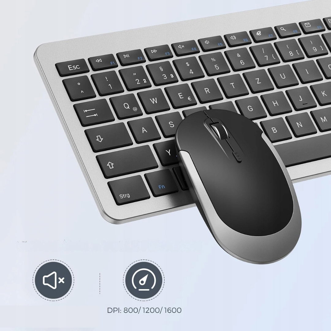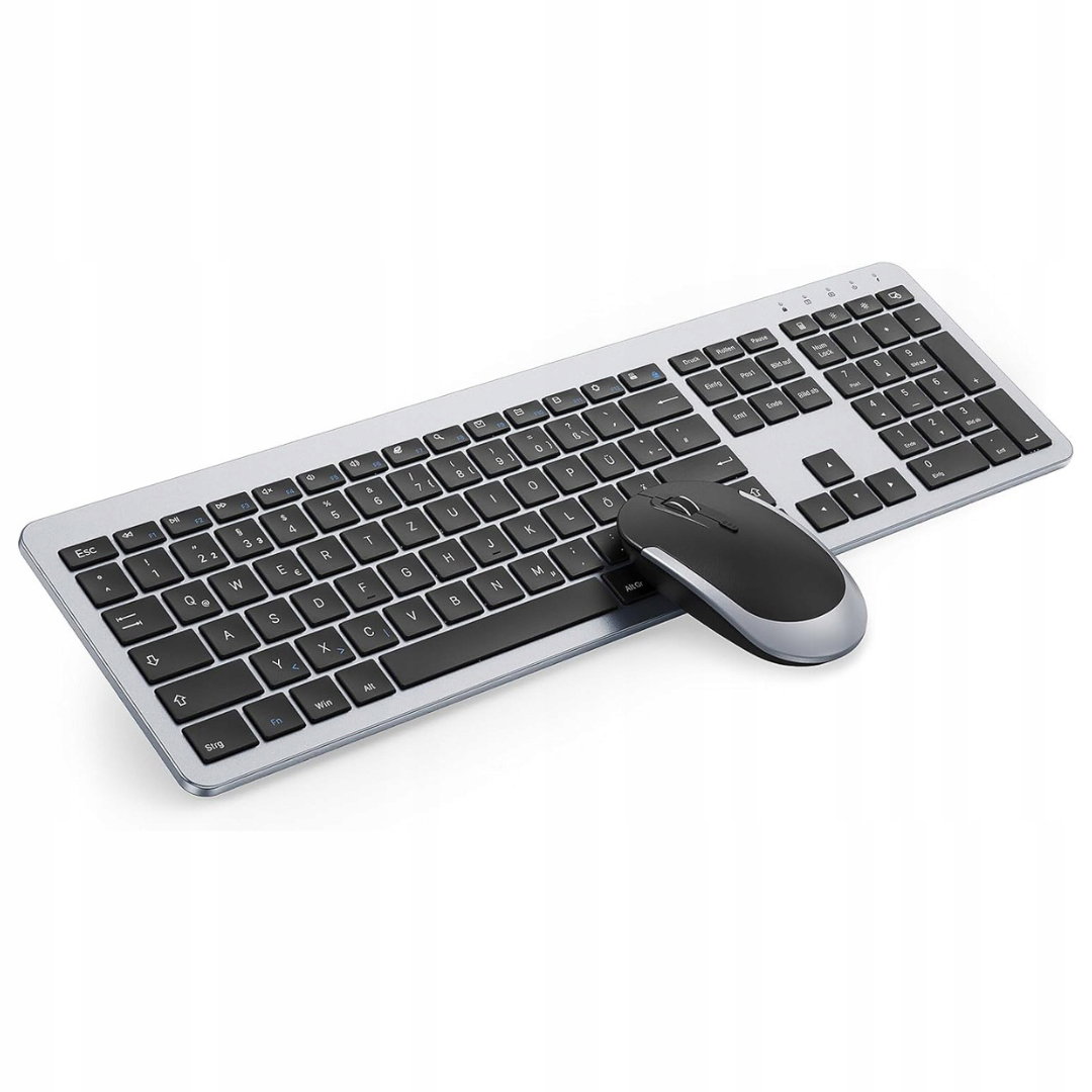 Seenda SK38-3 bezprzewodowy zestaw klawiatura i mysz, ultracienki akumulatorowy zestaw bezprzewodowy, ergonomiczna klawiatura bezprzewodowa z silikonową osłoną przeciwkurzową do PC/laptopa/TV, niemiecki układ DE QWERTZ, czarno-srebrny.