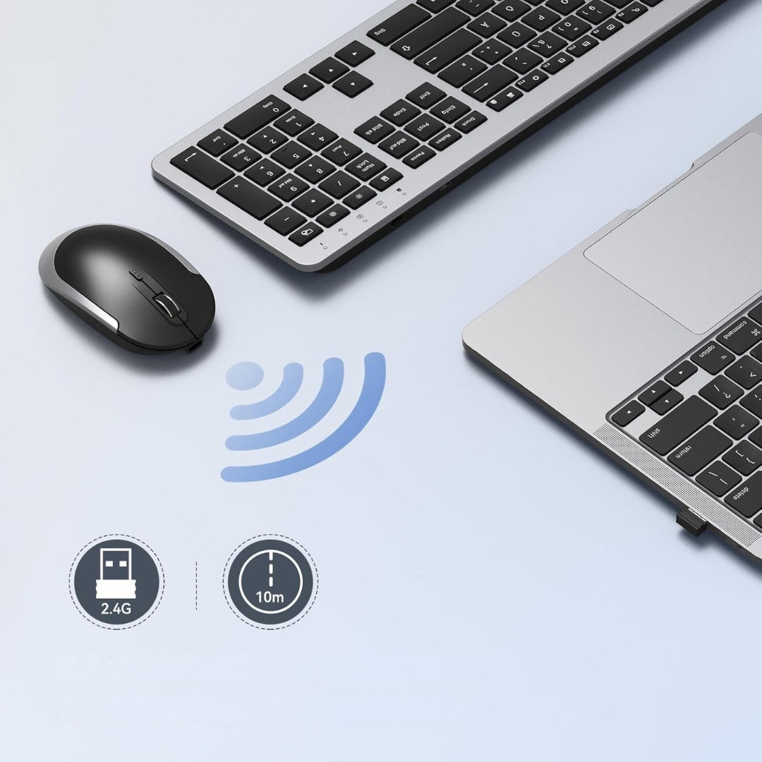 - Zaawansowane połączenie bezprzewodowe 2.4 GHz: technologia zapewnia szybkie i stabilne połączenie na odległość do 8 metrów, nawet w środowisku o dużym natężeniu sygnału WiFi, opóźnienia i przerwy w transmisji występują niezwykle rzadko, jeden odbiornik USB umieszczony z tyłu myszy obsługuje oba urządzenia w systemie plug & play.