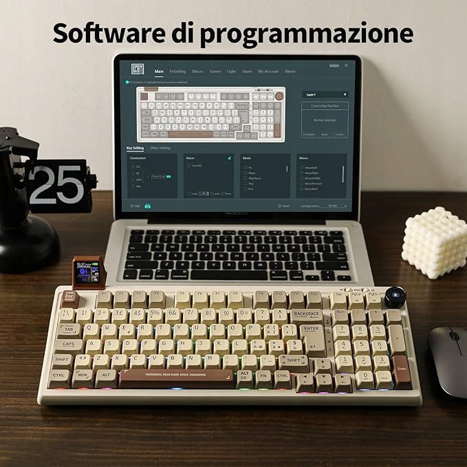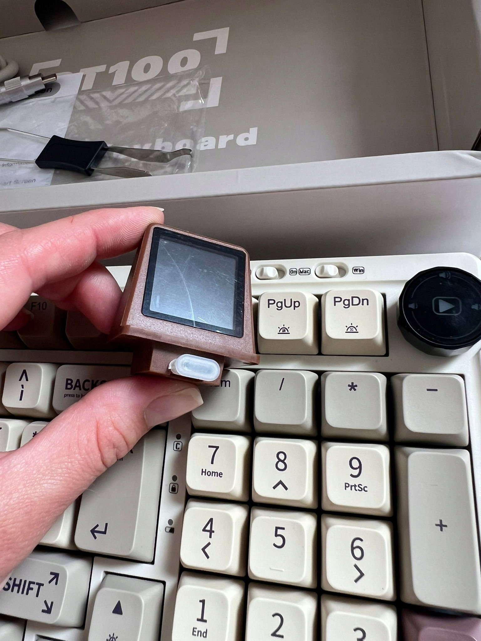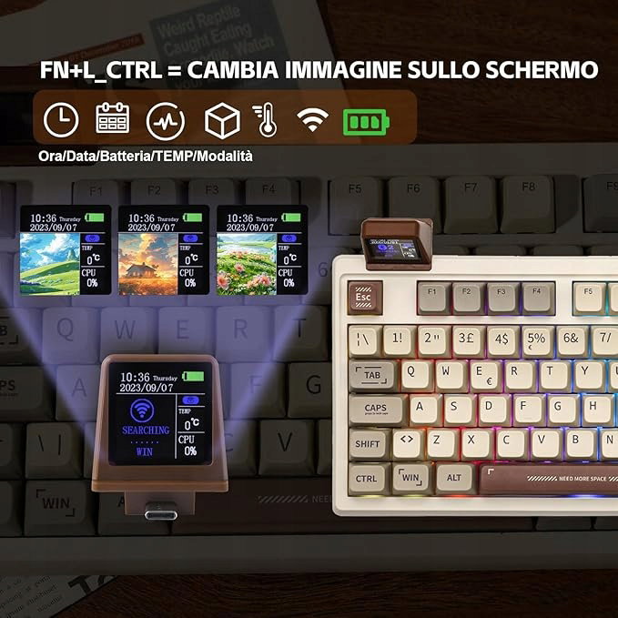 Posiada odłączany inteligentny monitor i pokrętło, które może rejestrować naciśnięcia klawiszy w celu sterowania multimediami. Bardzo przyjemny mini wyświetlacz jest świetną zabawą, która może służyć jako smartwatch z datą i godziną, prognozą pogody, poziomem naładowania baterii klawiatury lub w zasadzie wszystkim, co chcesz, z pewnymi ustawieniami i programowaniem.