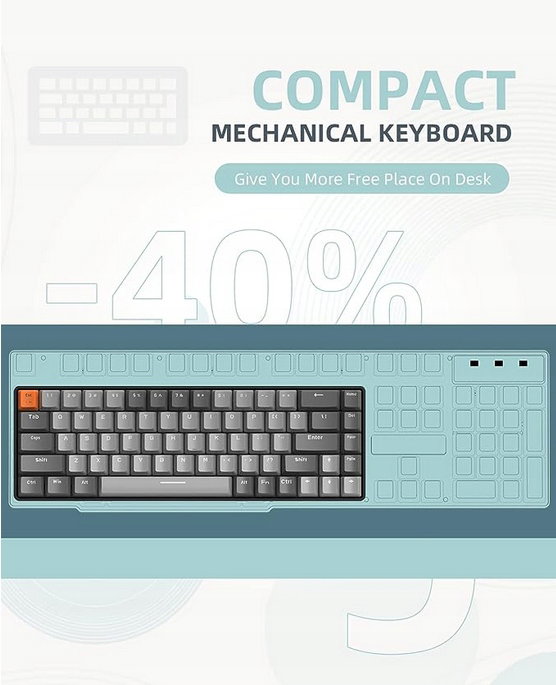 【68-klawiszowy układ i oddzielne klawisze strzałek】 W przeciwieństwie do mechanicznych klawiatur TKL lub klawiatur 61-klawiszowych, 68 klawiszy zachowuje kompaktowy układ, pamiętając o praktyczności klawiatury, z pełnym zestawem klawiszy kierunkowych i często używanych klawiszy sterujących. Podwójnie formowane wtryskowo nasadki klawiszy zapewniają delikatne wyczucie, a znaki są bardziej odporne na zużycie.