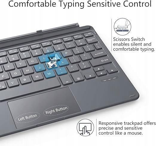 Ekskluzywny design dla Microsoft Surface Go 4 2023 / Surface Go 3 2021 / Surface Go 2 2020 / Surface Go 10" 2018, z lekko rozstawionymi klawiszami dla bardziej znajomego i wydajnego pisania, które przypomina tradycyjny laptop. (Uwaga: Przed użyciem należy usunąć folię ochronną z gładzika. Klawiatura QWERTY przeznaczona jest wyłącznie do systemów angielskich.)