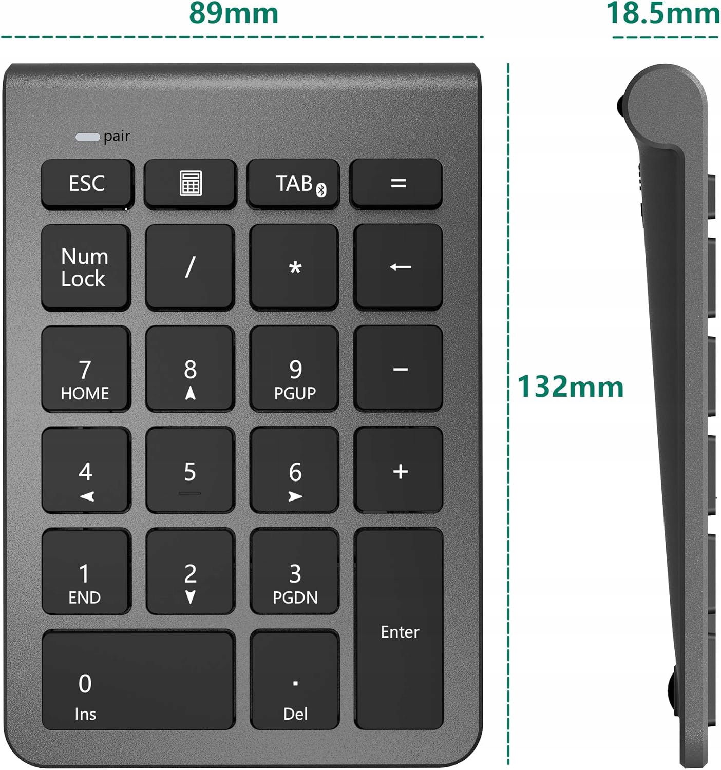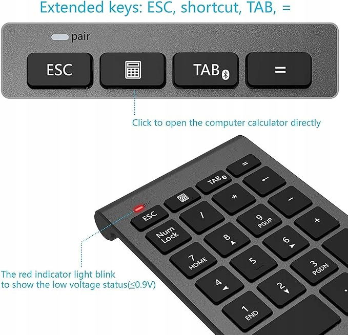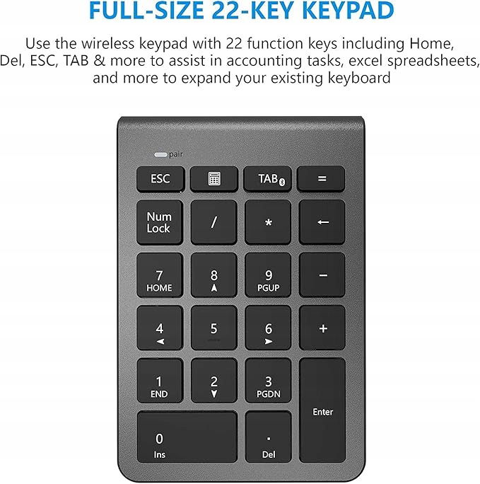 Wydajna klawiatura numeryczna Bluetooth z 22 klawiszami, oferująca wygodne skróty, takie jak Numlock, ESC czy Del. Doskonała do pracy z arkuszami kalkulacyjnymi, spełnia wszystkie potrzeby użytkowników w prosty sposób.