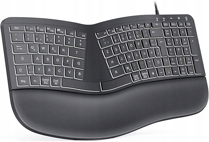 Ergonomiczna klawiatura z kablem, podświetlana klawiatura z podkładką pod nadgarstek, wygodna klawiatura Ergo z układem QWERTZ, kompatybilna z Mac i Windows, laptop, komputery – czarna