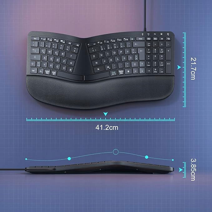 Układ QWERTZ i kompaktowy rozmiar - klawiatura zaprojektowana z układem QWERTZ. Jest bardziej kompaktowy, ale posiada wszystkie przyciski, których potrzebujesz, w tym blok cyfrowy. Wskazówka: Podobnie jak w przypadku innych ergonomicznych klawiatur może potrwać kilka dni, zanim się przyzwyczaisz