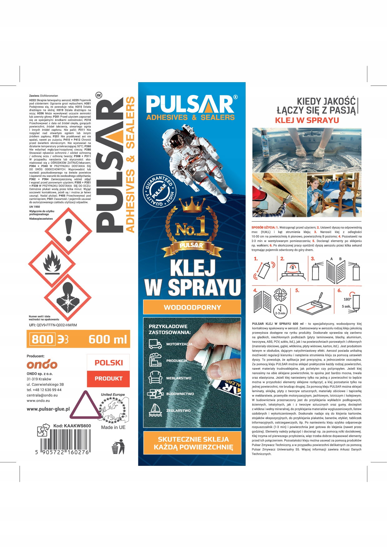 KLEJ TAPICERSKI W SPRAYU DO TAPICERKI MATERIAŁU TESKTYLIÓW PULSAR 600 ml