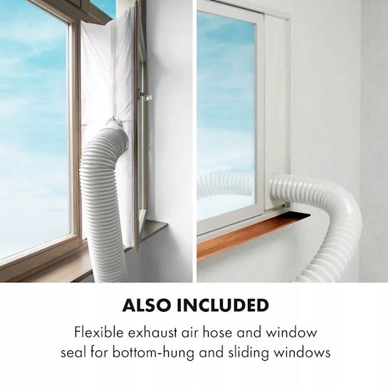 - W zestawie: elastyczny wąż powietrza wylotowego i uszczelka okienna do okien uchylnych i przesuwnych