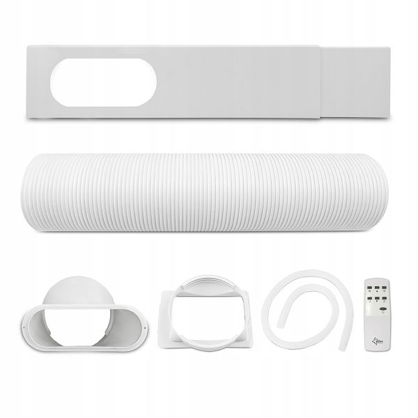 W zestawie wąż odprowadzający powietrze z adapterami, listwa przesuwna okna, wąż odpływowy, pilot zdalnego sterowania, zmywalny filtr przeciwkurzowy, schowek na kabel