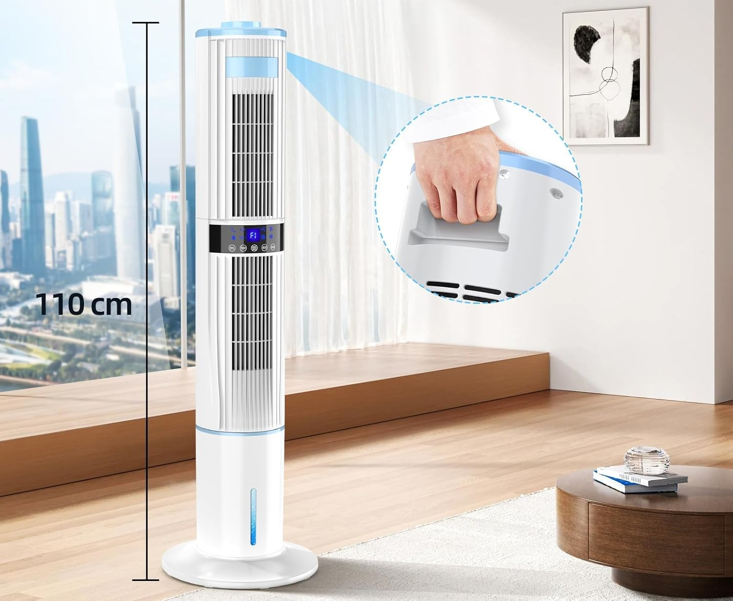 Klimatyzator przenośny 4 w 1 Porównaj tradycyjny wentylator wieżowy to tylko wentylator, nasza chłodnica z wentylatorem wieżowym integruje wentylator, nawilżacz, oczyszczacz powietrza i klimatyzator mobilny w jednym. Wystarczy dodać wodę i okłady z lodu (4 w zestawie), nacisnąć przycisk chłodzenia i szybko cieszyć się chłodnym powietrzem.