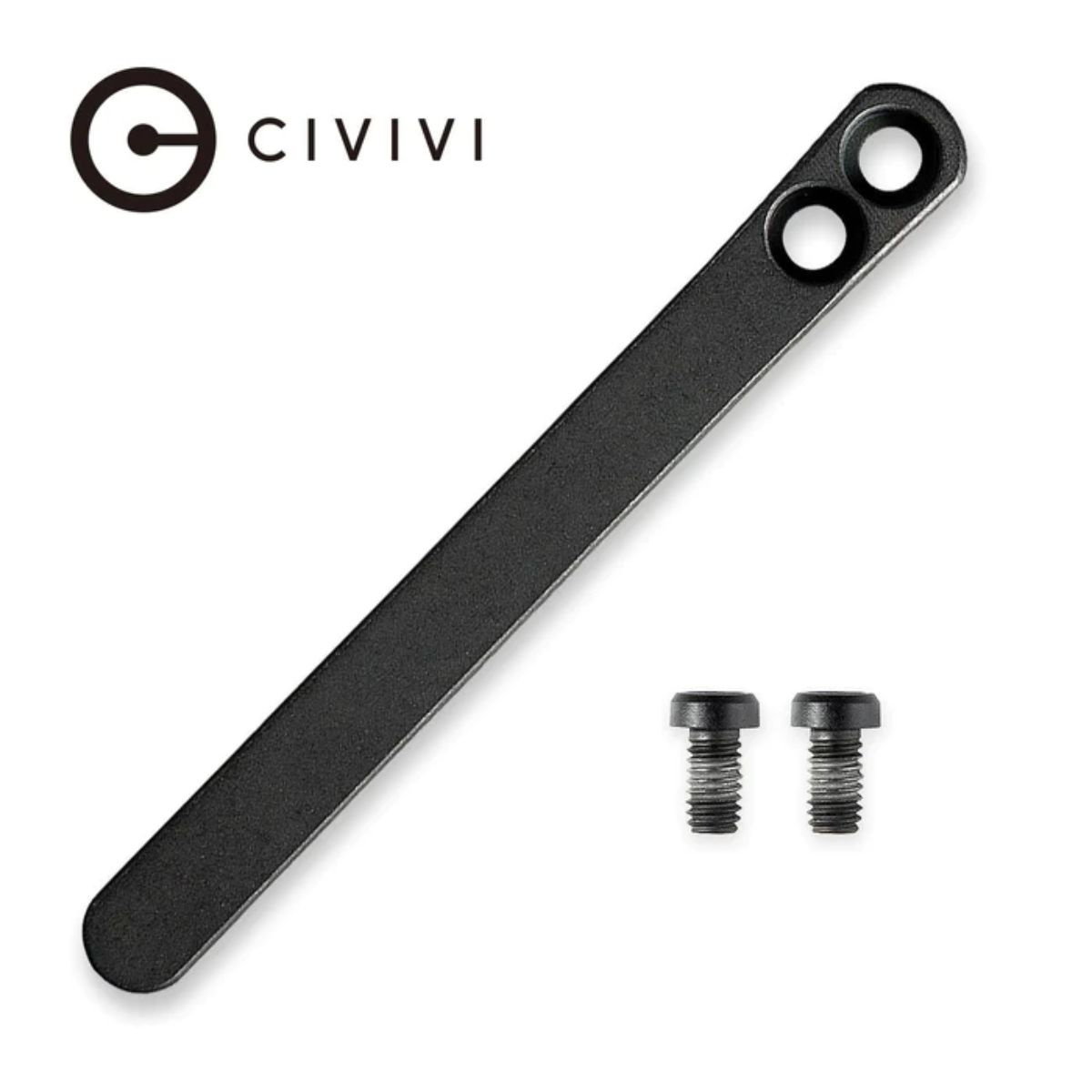 Klips z tytanu pokrytego czarną powłoką do noży WE, Civivi, Sencut oraz do wszystkich modeli z odpowiednim rozstawem otworów mocujących. Dołączony komplet tytanowych śrub.