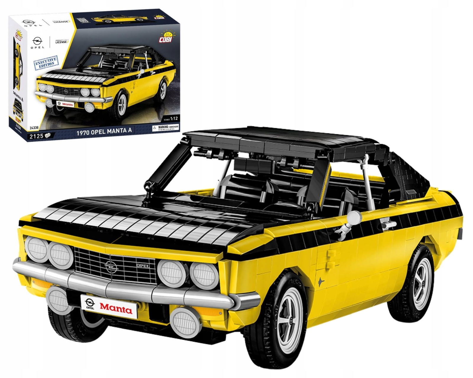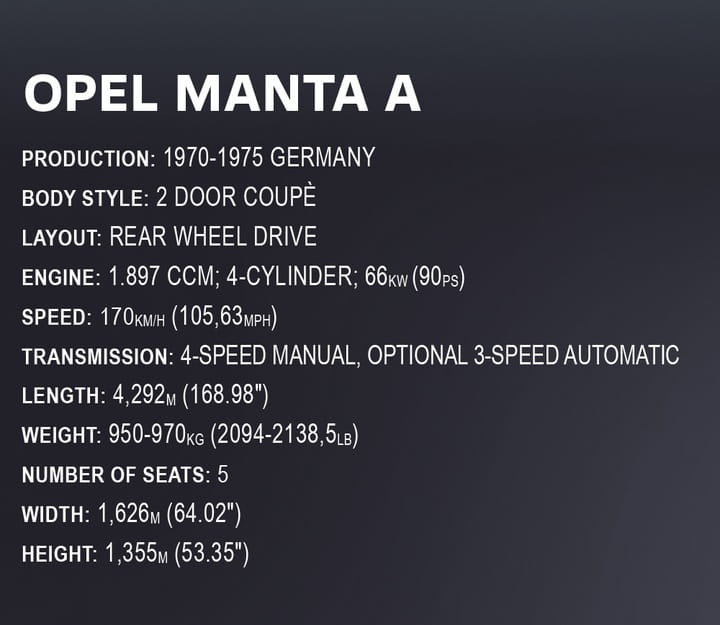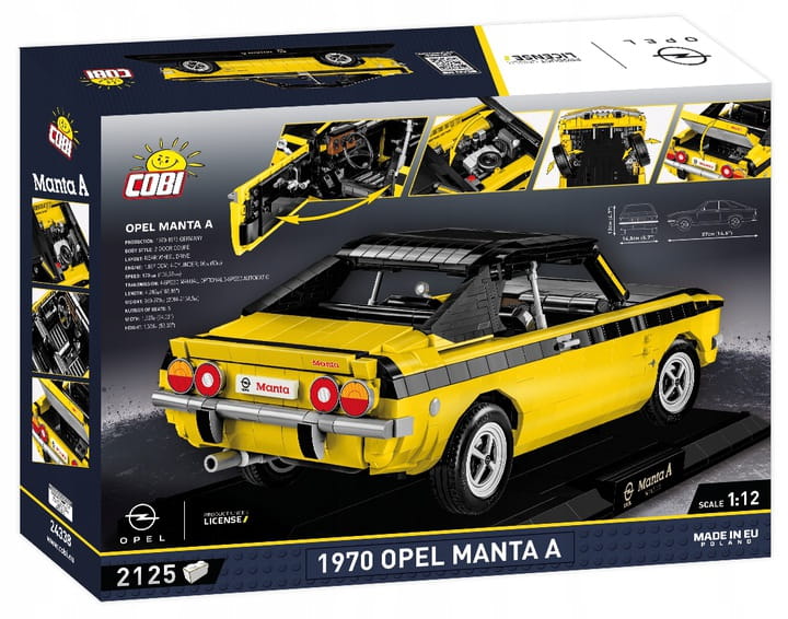 Opel Manta A to klasyk, który na trwałe zapisał się w historii motoryzacji. Jest to skrojona na miarę potrzeb europejczyków odpowiedź na amerykańskie Pony Cars (samochody sportowe). Samochód charakteryzował się nadwoziem, które było nie tylko eleganckie, ale również dynamiczne i pozbawione zbędnych dodatków. Przestronne wnętrze oferowało miejsce dla 5 pasażerów oraz przestronny bagażnik. Jednostka napędowa o pojemności 1.9 l i mocy 90 KM umożliwiała osiągnięcie prędkości 170 km/h. O popularności auta świadczy niemal pół miliona sprzedanych egzemplarzy w zaledwie 5 lat. Zjawisko Manta-manii było widoczne zarówno na rynku akcesoriów samochodowych, jak i w kulturze masowej.Legendarny Opel Manta A w wersji Executive Edition to kolejna mocna pozycja w motoryzacyjnej serii od COBI! Zaawansowany technicznie klockowy zestaw w dużej modelarskiej skali 1:12 ma aż 37 cm długości i doskonale prezentuje się na czarnej klockowej podstawce zawierającej tabliczkę z nazwą auta. Sportowy samochód Opel Manta A wydany został na oryginalnej licencji marki Opel. Zestaw został zaprojektowany z 2125 elementów. Model wyróżnia się zastosowaniem dużej ilości, wyłącznie wysokiej jakości nadruków! Całkowicie zrezygnowaliśmy z naklejek. Specjalnie na potrzeby tak dużych zestawów zaprojektowano nowe elementy, zapewniające dodatkowe funkcjonalności. Ruchoma kierownica, którą możemy skręcać koła, zawiasy do otwieranych drzwi, elementy karoserii i wykończenia. Pod uchylną maską znajduje się odwzorowany z klocków silnik. Liczne detale takie jak klamki, światła, zegary tworzą spójną całość z doskonale odwzorowaną charakterystyczną bryłą tego pojazdu.Model jest idealny dla kolekcjonerów oraz miłośników klasycznej motoryzacji. Czytelna i intuicyjna instrukcja oraz klocki zapakowane w numerowane woreczki sprawiają, że proces budowy będzie przebiegał w sposób sprawny i satysfakcjonujący.Opel to niemiecki producent samochodów osobowych, sportowych i dostawczych, który za sprawą wielu udanych modeli na trwałe zapisał się w historii motoryzacji. Teraz za sprawą klocków konstrukcyjnych COBI, kolejna legenda motoryzacji powraca w wyjątkowym wydaniu kolekcjonerskim z podstawką ekspozycyjną i tabliczką z nazwą. Zbuduj to!