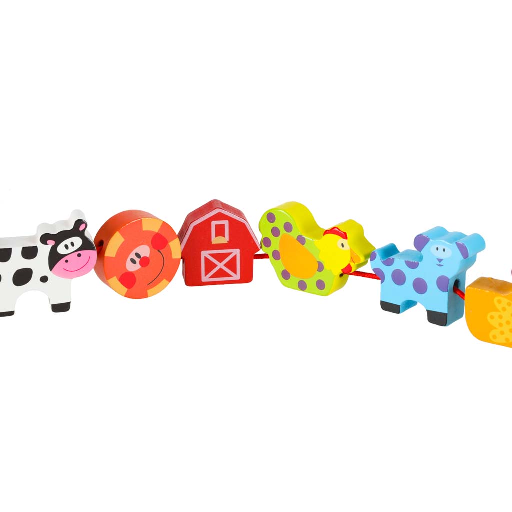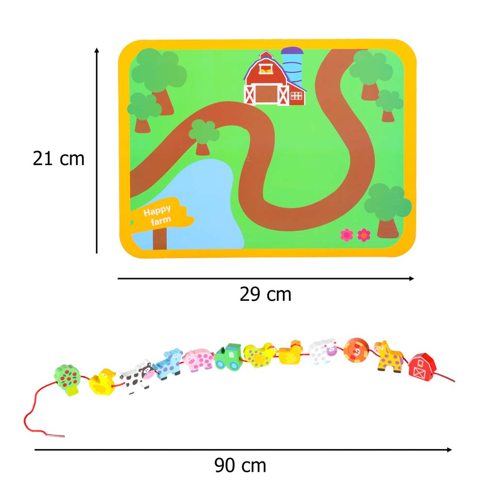 NAUKA PRZEZ ZABAWĘ - Zestaw drewnianych klocków do nawlekania to idealny sposób na rozwój umiejętności manualnych i kreatywnego myślenia u najmłodszych. Dziecko może nawlekać kolorowe elementy na sznurek lub dopasowywać je do planszy, poznając zwierzęta i życie na farmie w atrakcyjny, edukacyjny sposób.