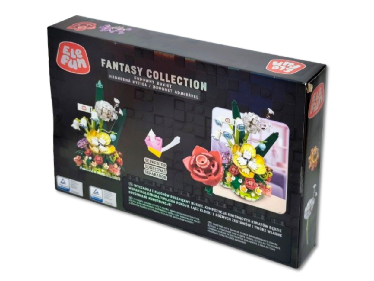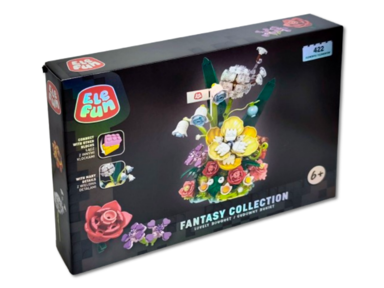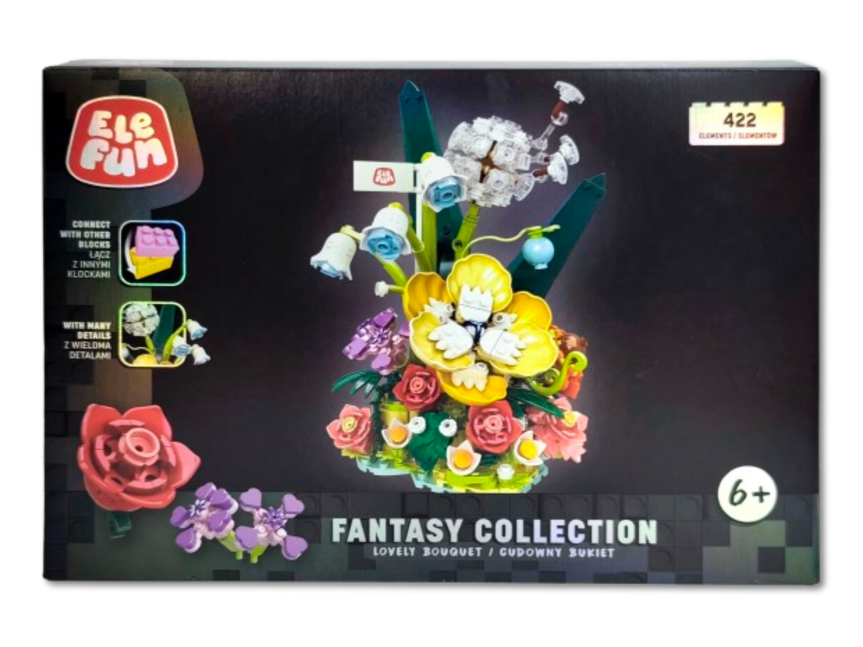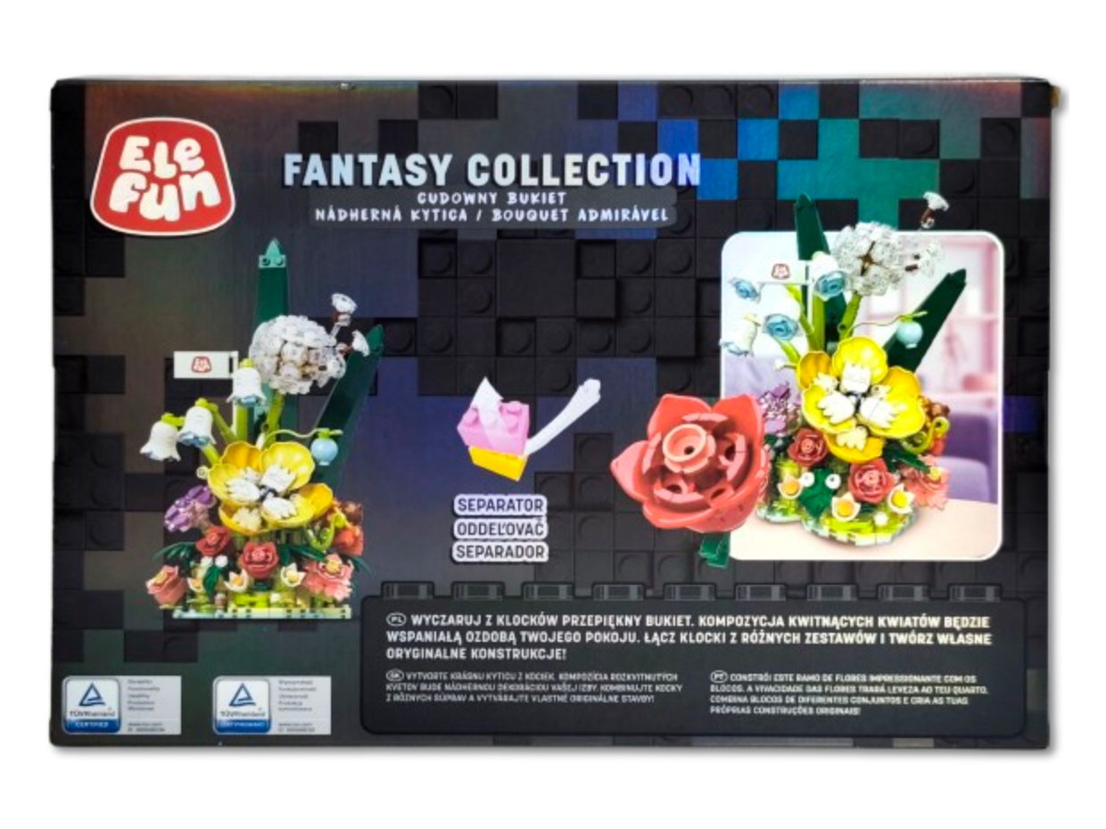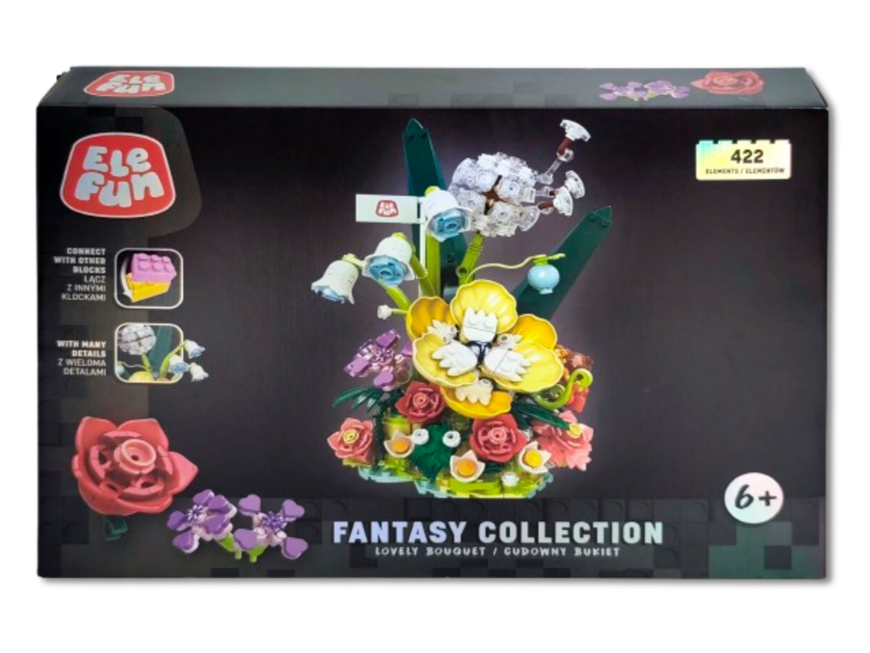 Klocki Elefun Fantasy Collection - Cudowny Bukiet 21004, to klocki które zapewnią dziecku wiele godzin wspaniałej zabawy, a dodatkowo wpłyną pozytywnie na kreatywność, wyobraźnię i rozwój zdolności manualnych. Klocki są kompatybilne z innymi markowymi klockami. Zestaw zawiera klocki niezbędne do złożenia kompozycji kwitnących kwiatów, obrazkową instrukcję składania (32 strony) oraz separator klocków ułatwiający rozdzielanie klocków.