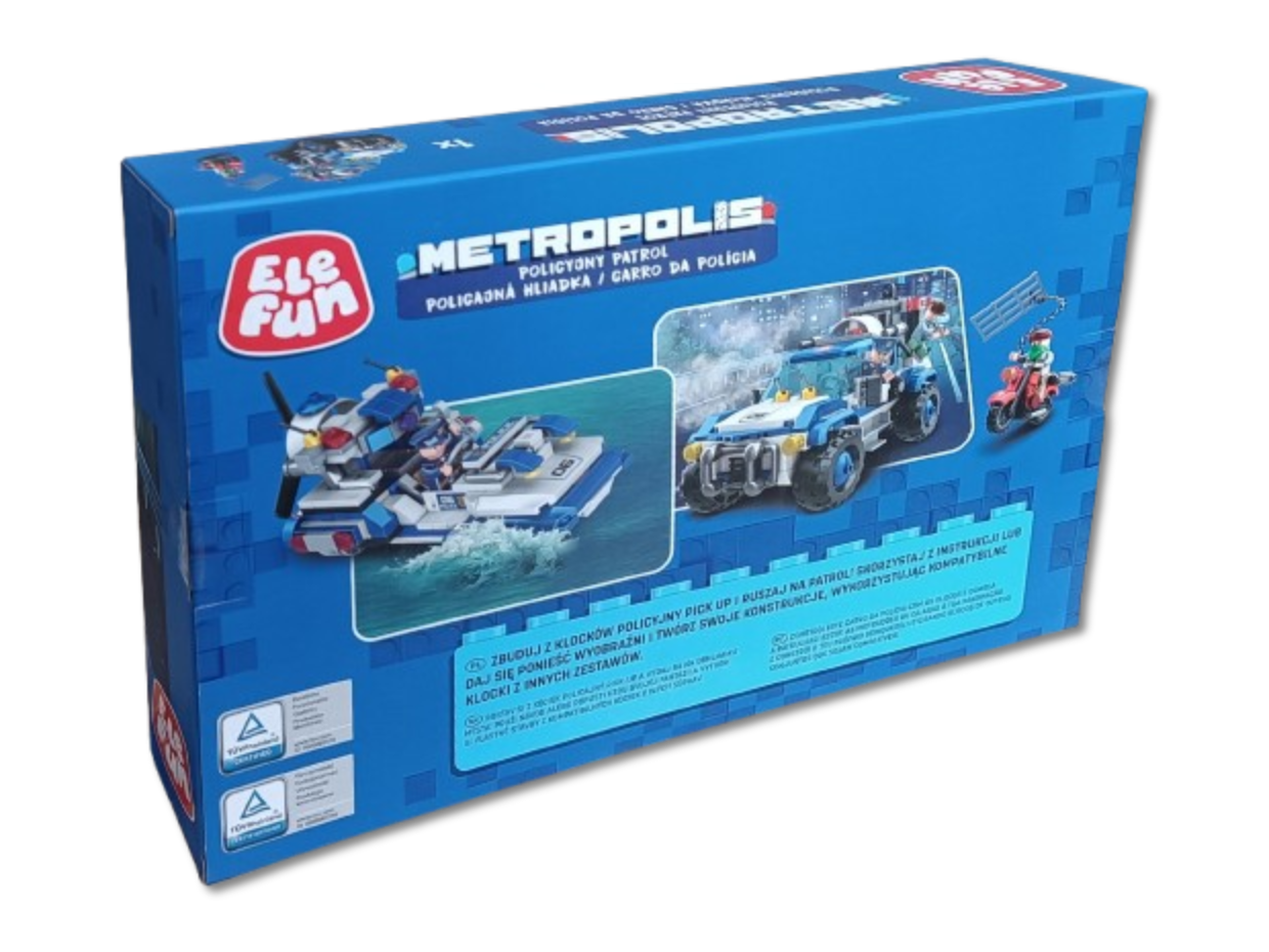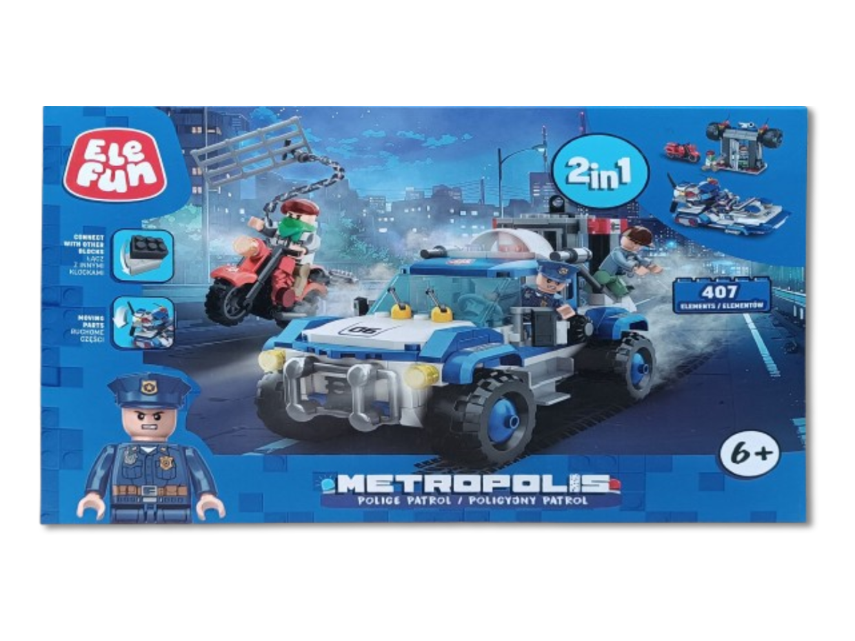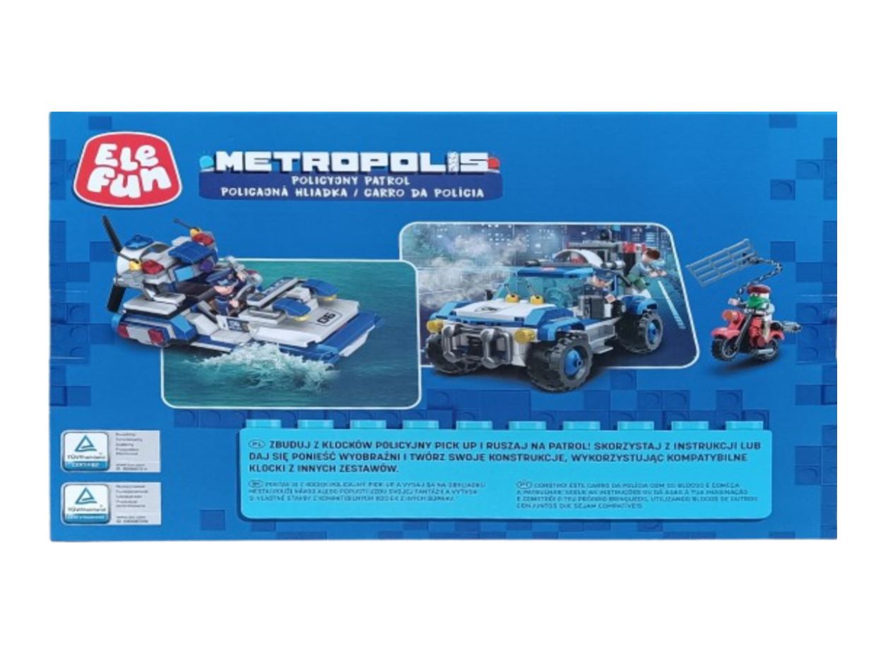 Klocki Elefun Metropolis Policyjny patrol (2w1) 681004, to klocki które zapewnią dziecku wiele godzin wspaniałej zabawy, a dodatkowo wpłyną pozytywnie na kreatywność, wyobraźnię i rozwój zdolności manualnych. Klocki są kompatybilne z innymi markowymi klockami. Jest to zestaw 2w1 dzięki czemu można z niego zbudować wóz patrolowy lub motorówkę. Zestaw zawiera także jeden motocykl, 3 figurki postaci, separator klocków ułatwiający rozłączanie klocków oraz papierową obrazkową instrukcję składania (62 strony).