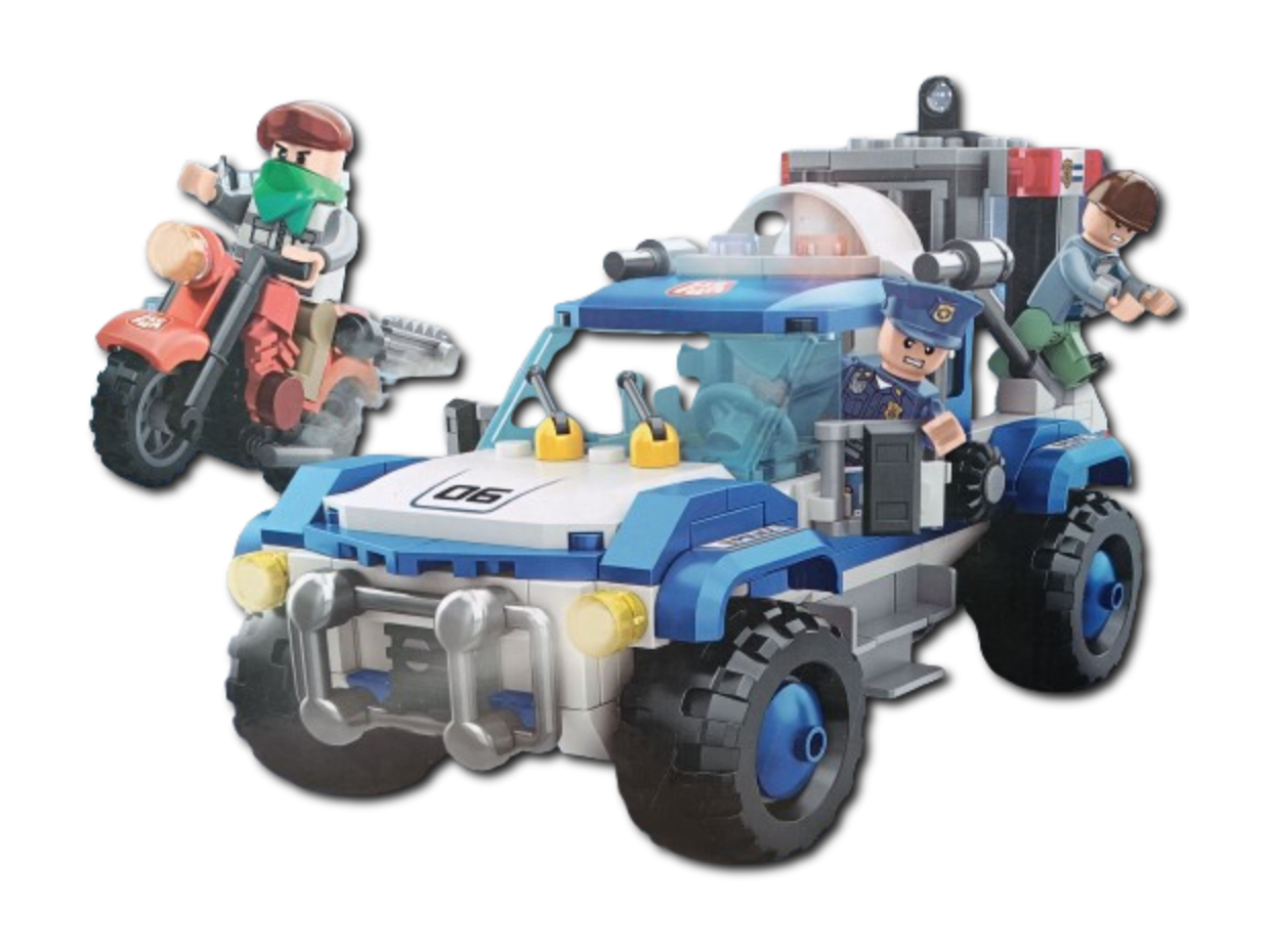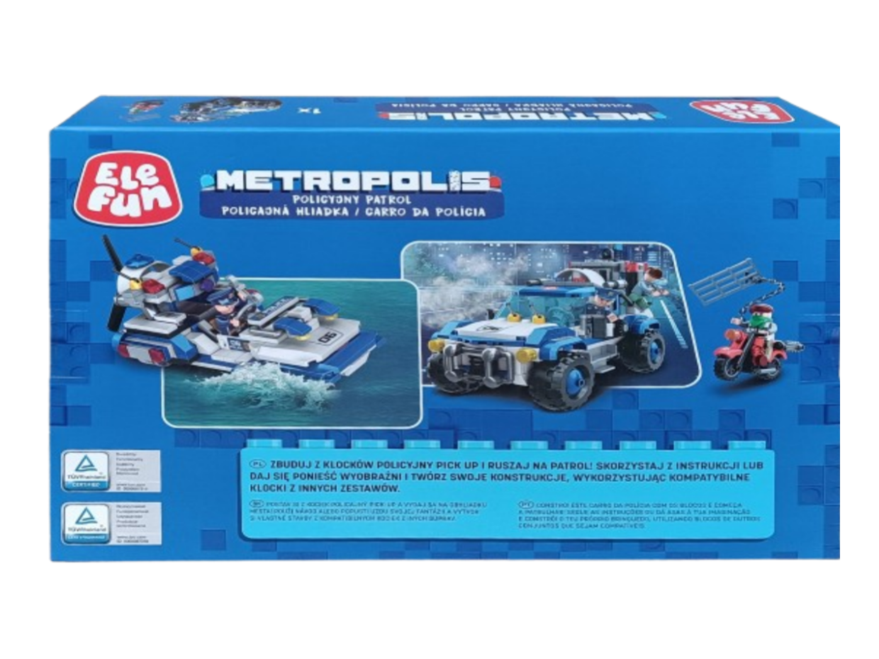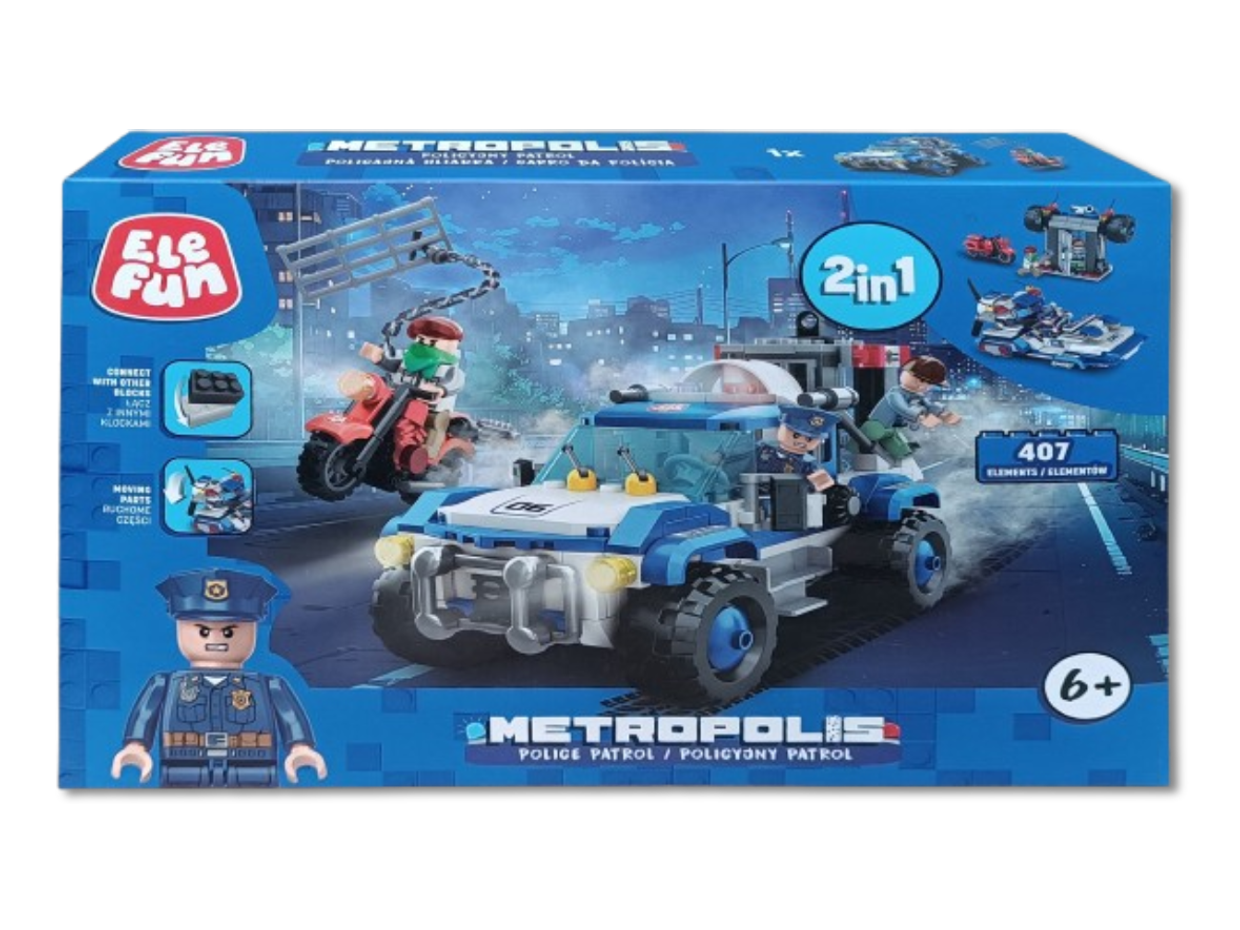Klocki Elefun Metropolis Policyjny patrol (2w1) 681004, to klocki które zapewnią dziecku wiele godzin wspaniałej zabawy, a dodatkowo wpłyną pozytywnie na kreatywność, wyobraźnię i rozwój zdolności manualnych. Klocki są kompatybilne z innymi markowymi klockami. Jest to zestaw 2w1 dzięki czemu można z niego zbudować wóz patrolowy lub motorówkę. Zestaw zawiera także jeden motocykl, 3 figurki postaci, separator klocków ułatwiający rozłączanie klocków oraz papierową obrazkową instrukcję składania (62 strony).