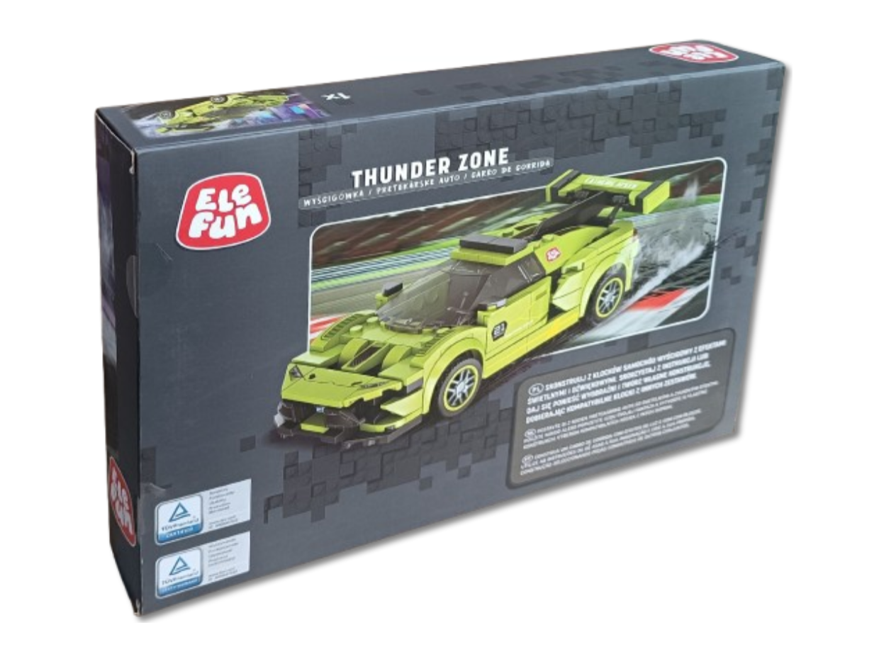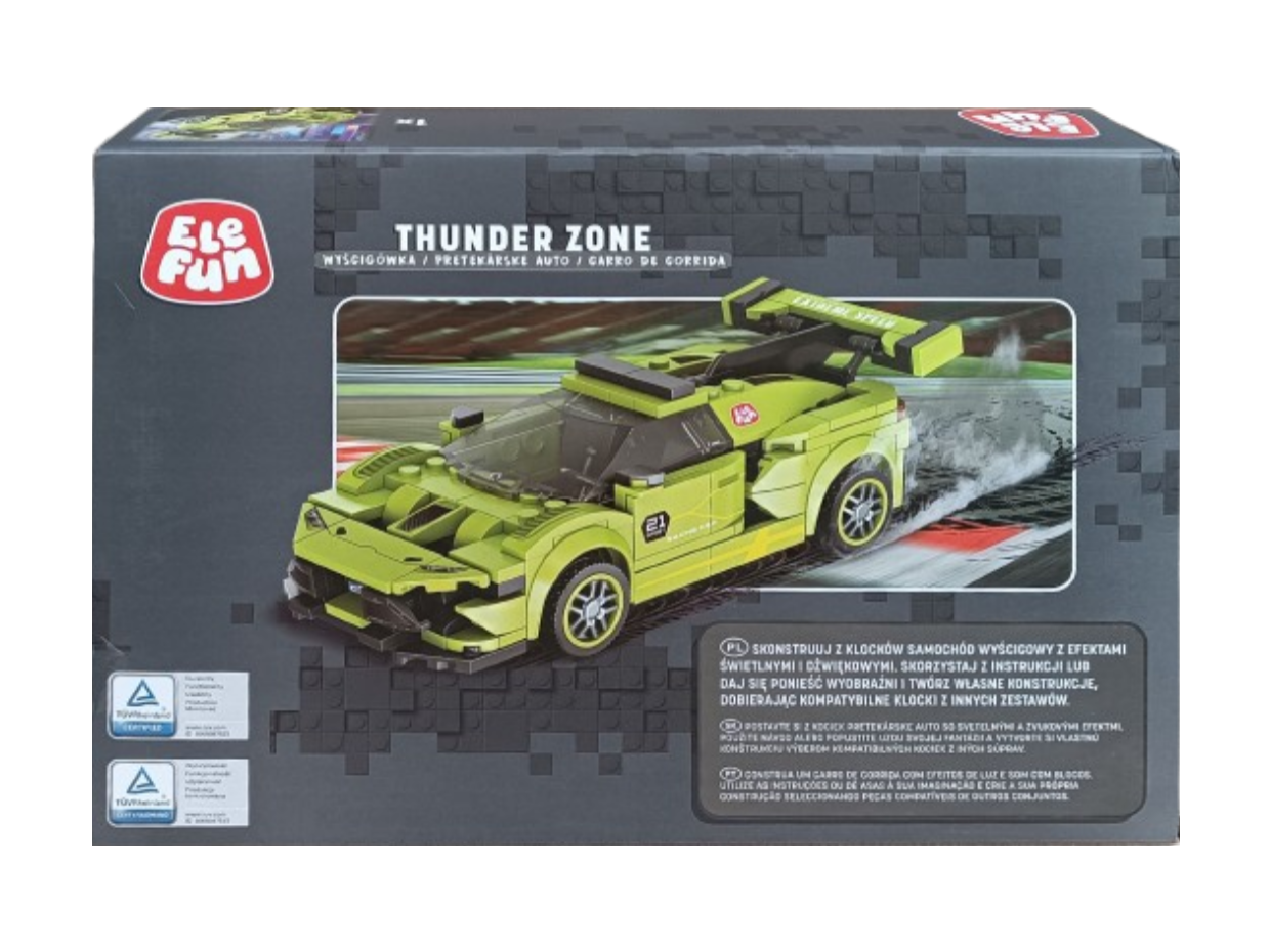 Klocki Elefun Thunder Zone - Wyścigówka FC1610, to klocki które zapewnią dziecku wiele godzin wspaniałej zabawy, a dodatkowo wpłyną pozytywnie na kreatywność, wyobraźnię i rozwój zdolności manualnych. Klocki są kompatybilne z innymi markowymi klockami. Zestaw zawiera klocki niezbędne do złożenia wyścigówki z napędem Pull-Back dzięki któremu wystarczy postawić auto na podłodze, pociągnąć je do tyłu i puścić aby się zaczęło samo poruszać. W zestawie znajduje się również papierowa obrazkowa instrukcja składania (16 stron) oraz zestaw naklejek do oklejenia klocków.
