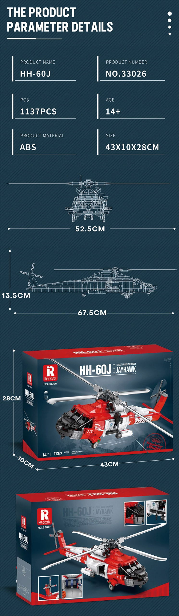 Reobrix  HH-60J to ekscytujący zestaw, który przenosi entuzjastów lotnictwa w świat zaawansowanych śmigłowców ratunkowych. Model wiernie odwzorowuje charakterystyczne cechy HH-60J, z aerodynamiczną sylwetką, ruchomymi wirnikami i szczegółowym kokpitem, co dodaje realizmu konstrukcji. Zestaw zawiera również realistyczne detale, takie jak wyposażenie ratunkowe, liny i wciągarki, co sprawia, że jest nie tylko estetyczny, ale także interaktywny.