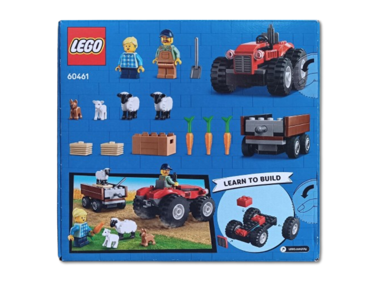 Klocki LEGO City - Czerwony traktor z przyczepą i owcą 60461, to klocki które zapewnią dziecku wiele godzin wspaniałej zabawy, a dodatkowo wpłyną pozytywnie na kreatywność, wyobraźnię i rozwój zdolności manualnych. Klocki są kompatybilne z innymi markowymi klockami. W zestawie: Traktor z przyczepką, 2 figurki, 2 figurki owiec,1 figurka jagnięcia oraz 1 figurka pieska. Złożony traktor ma 5cm wysokości, 6cm szerokości i 9cm długości. Zestaw posiada papierową instrukcję, istnieje także możliwość skorzystania z instrukcji elektronicznej po zainstalowaniu na urządzeniu mobilnym aplikacji Lego Builder.