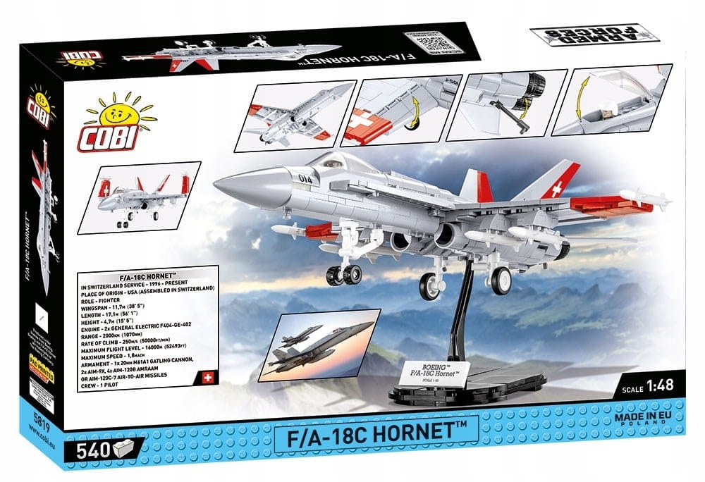 F/A-18C Hornet™ to wyjątkowy model myśliwca wielozadaniowego w barwach Szwajcarii. Samolot został przygotowany w modelarskiej skali 1:48 przy wykorzystaniu 540 klocków konstrukcyjnych COBI. W zestawie znajdziesz wysokiej jakości nadruki odwzorowujące malowanie oryginalnej maszyny. Model został wyposażony w składane podwozie i obracające się koła. Pod skrzydłami znajduje się pokaźny arsenał uzbrojenia. W kabinie możemy umieścić specjalny klocek-pilota. W zestawie znajduje się również klockowa podstawka ekspozycyjna oraz tabliczka zawierająca nazwę samolotu. Ten ekskluzywny licencyjny zestaw jest skierowany do każdego niezależnie od wieku fana lotnictwa i militariów. Samolot prezentuje się równie atrakcyjnie w poważnym gabinecie oraz w pokoju nastolatka.Boeing F/A-18CHornet™ – to amerykański ponaddźwiękowy wielozadaniowy samolot pokładowy US Navy pozostający w produkcji od 1978 roku. Jest to jeden z najnowocześniejszych samolotów marynarki wojennej USA. Samoloty F-18 zastąpiły w Szwajcarii francuskie myśliwce Mirage IIIS. W 1992 roku podpisano kontakt na dostawę 34 sztuk. Zamówiono 26 samolotów w wersji jednomiejscowej C oraz 8 samolotów w wersji dwumiejscowej D. Tylko pierwsze dwie maszyny zostały zbudowane całkowicie w USA. Pozostałe zbudowano w szwajcarskich zakładach RUAG w Emmen.