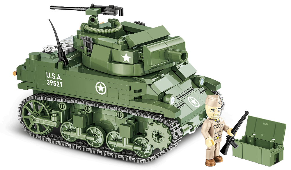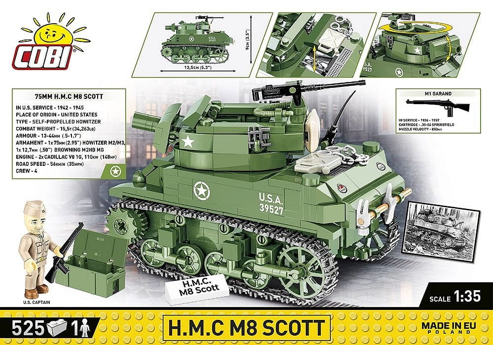 M8 Scott to haubica samobieżna konstrukcji amerykańskiej z okresu II wojny światowej bazująca na podwoziu czołgu lekkiego Stuart. Niekiedy używano nazwy M8 General Scott. Pojazd był uzbrojony w haubicę 75 mm umieszczoną w otwartej wieży. Spawany pancerz miał zapewniać ochronę załodze. Od września 1942 roku do stycznia 1944 roku powstało około 1778 pojazdów tego typu.Model COBI został opracowany w skali 1:35 pasującej do figurek i składa się z 525 klocków konstrukcyjnych. Funkcjonalności modelu to: dostęp do klockowej atrapy silnika, obracająca się wieża, ruchome działo i działająca trakcja gąsienicowa.Wszystkie elementy graficzne to wysokiej jakości nadruki. Figurka przedstawia amerykańskiego żołnierza w randze kapitana. Do zestawu dołączona jest tabliczka z nadrukowaną nazwą zestawu. Nasza kolekcja w skali 1:35 nie może się obyć bez tego zestawu! Zbuduj historię, klocek po klocku!