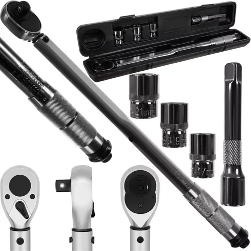 Klucz dynamometryczny z nakładkami oraz przedłużką został wyprodukowany z myślą o najbardziej wymagających pracach. Precyzyjnie dobrane materiały, wysoka dokładność wykonania oraz odporność na odkształcenia i pęknięcia decydują o jego niezawodności. Narzędzie, jakim jest klucz dynamometryczny, będzie idealne do odkręcania i zakręcania połączeń śrubowych różnego rodzaju. Wielofunkcyjny klucz z grzechotką sprawdzi się przy pracach wymagających precyzji i staranności, a także przy codziennych pracach ze śrubami czworokątnymi, sześciokątnymi, nakrętkami motocyklowymi oraz haczykami.