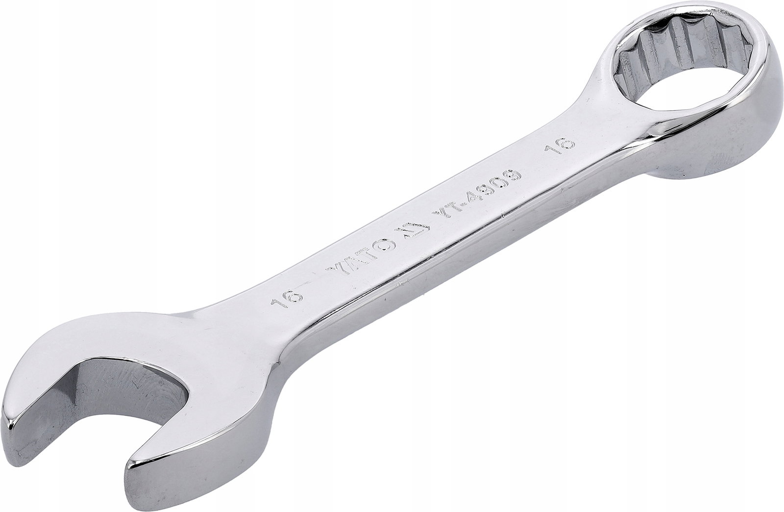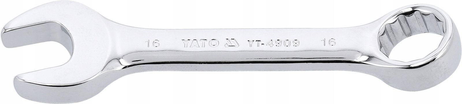 Klucz płasko-oczkowy krótki marki Yato. Wykonany ze stali chromowo-wanadowej 40CrV, charakteryzującej się długą żywotnością. Dwunastokątna końcówka klucza oczkowego, dodatkowo wygięta ułatwia manewrowanie kluczem.