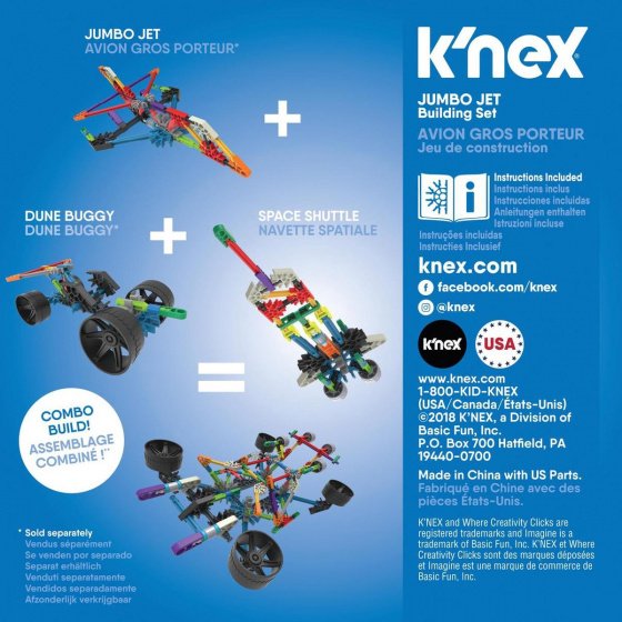 K'NEX Jumbo Jet to kreatywny zestaw konstrukcyjny dla dzieci od 5 lat. Zawiera 57 plastikowych elementów, z których można zbudować model jumbo jeta zgodnie z instrukcją, a także tworzyć własne konstrukcje. To świetna zabawa rozwijająca koordynację ręka-oko, zdolności manualne i wyobraźnię przestrzenną. Dzięki możliwości łączenia z innymi zestawami K'NEX – można zbudować różne pojazdy i maszyny.