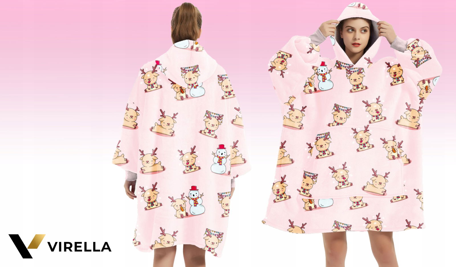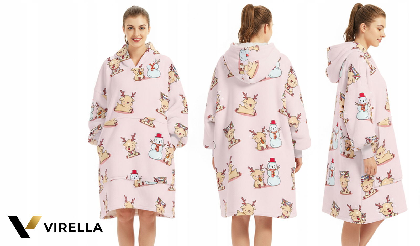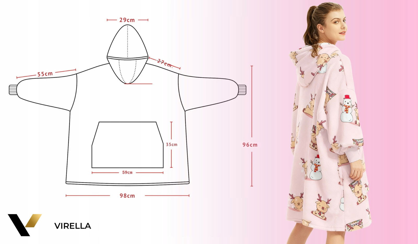 ✅ Mega Gruba Dwuwarstwowa (Polar + Sherpa) | ✅Flanela 200 g/m² (zewn.) + Sherpa 230 g/m² | ✅ Oversize Unisex | ✅ Kieszeń “Kangurek” | ✅ Kaptur | ✅ Miękka Jak Owieczka | ✅ Ciepłe Skarpety W Zestawie | ✅ Estetyczne Pakowanie Na Prezent | ✅ Różowy Świąteczny Wzór
