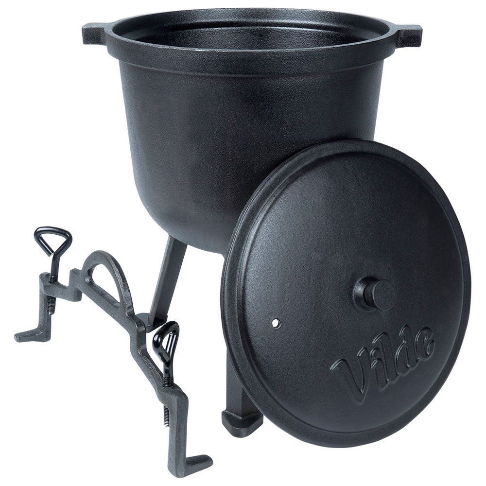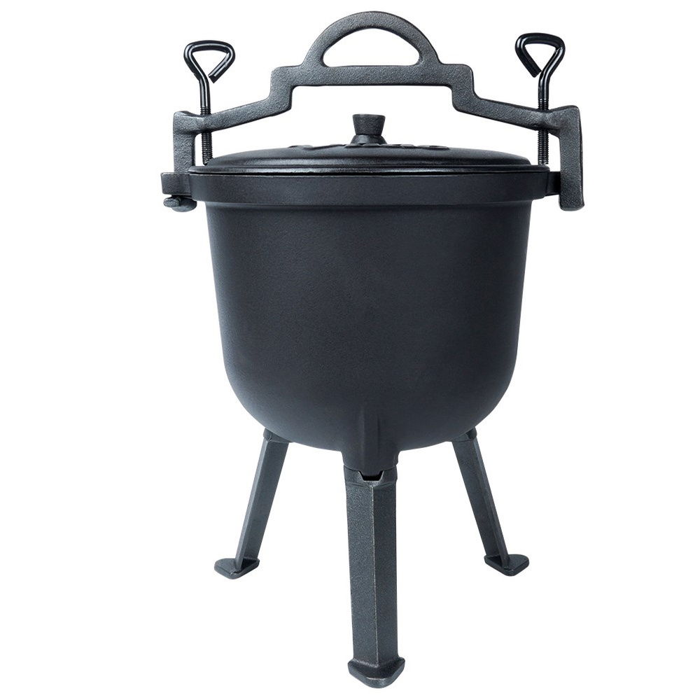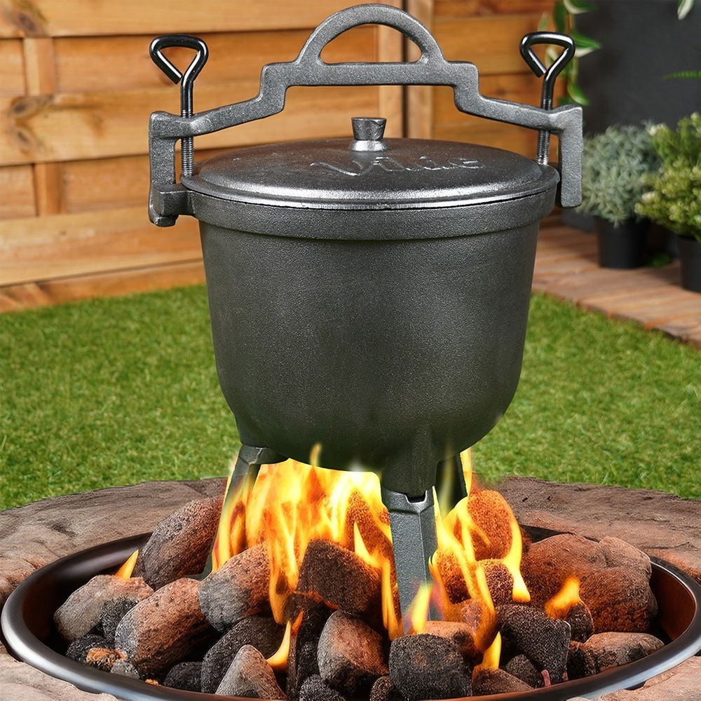 Okrągły kociołek żeliwny na nóżkach z pokrywką i uchwytem do zawieszenia. Idealny do gotowania, pieczenia, duszenia oraz smażenia potraw na ognisku, grillu lub nad otwartym ogniem. Potrawy przygotowane w kociołku będą soczyste i aromatyczne. Przydatny w trakcie różnego rodzaju spotkań, uroczystości czy imprez organizowanych na świeżym powietrzu.